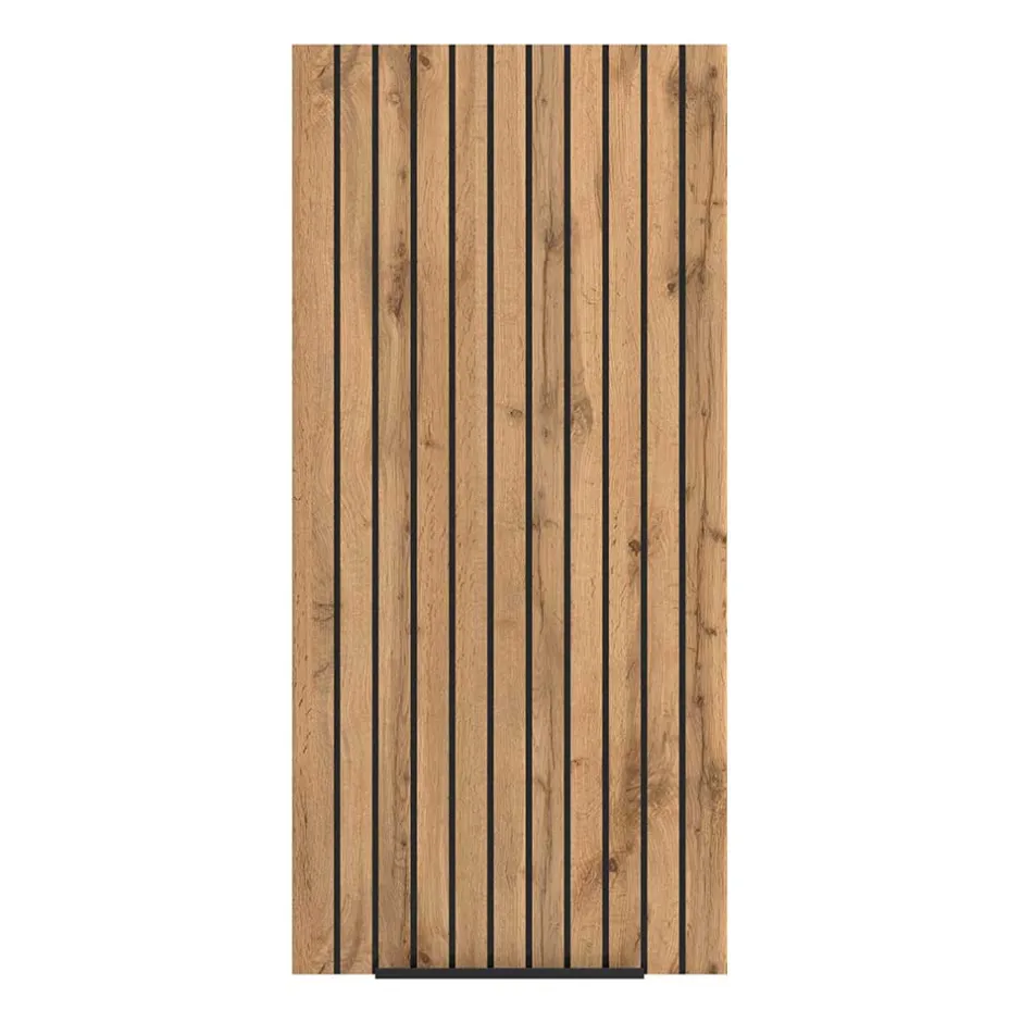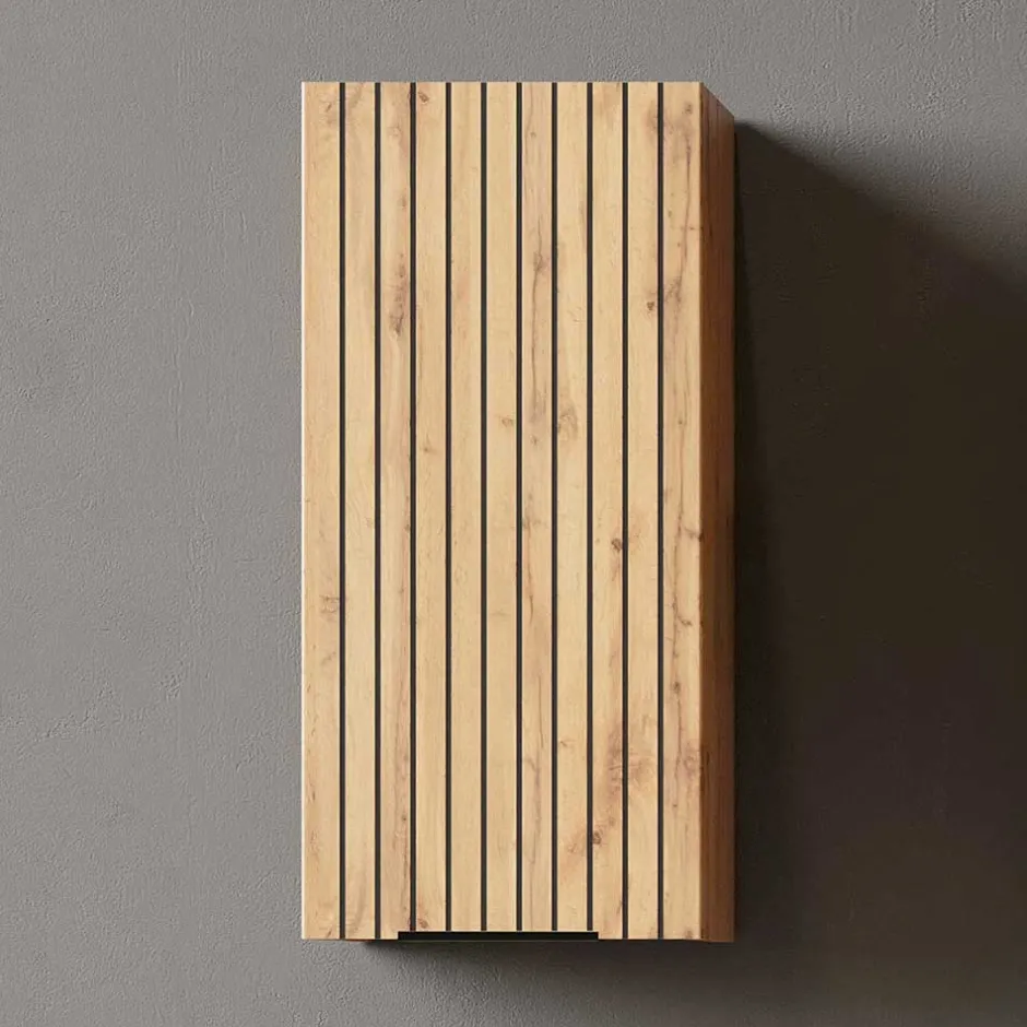 Gefertigt aus robuster Spanplatte, ist der Schrank mit einer strapazierfähigen Melaminbeschichtung in edler Wildeiche-Holzoptik versehen – eine Oberfläche, die nicht nur besonders pflegeleicht, sondern auch widerstandsfähig gegen Feuchtigkeit und Abrieb ist. Die Rückseite der Tür ist schwarz foliert, was dem Möbelstück zusätzlichen visuellen Tiefgang verleiht. Die Front in prägnanter Rillenoptik mit schwarzem Untergrund sorgt für ein modernes, fast skulpturales Erscheinungsbild – ein echter Hingucker in jedem Bad.