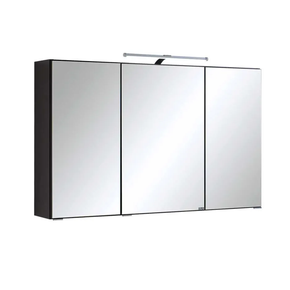 Ein Spiegelschrank in drei Breiten (60, 80 oder 100 cm, Höhe 64 cm, Tiefe 20 cm ohne Aufbauleuchte / mit Aufbauleuchte 67 cm hoch, 28 cm tief). Drei vollflächig verspiegelte Türen verbergen sechs Glasböden für Ihre Badutensilien. Integriert sind eine energiesparende LED-Aufbauleuchte, eine innenliegende Steckdose samt Konverter und Schalter sowie dezente Metallgriffe an der Unterkante.