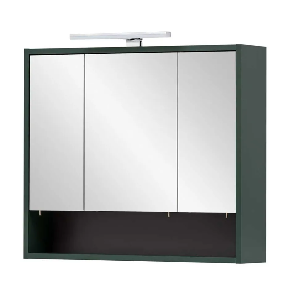 - Spiegelschrank (70x64x16 cm): Dieser Spiegelschrank ist mehr als nur ein Spiegel – er ist ein echtes Raumwunder! Mit drei Türen, die dank der Anschlagdämpfung sanft schließen, drei Glasböden für flexible Ablageflächen und einer innenliegenden Steckdose sind alle wichtigen Dinge sicher und praktisch verstaut. Das offene Fach bietet schnellen Zugriff auf die wichtigsten Pflegeprodukte. Die hochwertige LED-Aufsatzleuchte (Breite: 30,8 cm) sorgt für eine klare und angenehme Beleuchtung, die jeden Morgen perfekt starten lässt.
