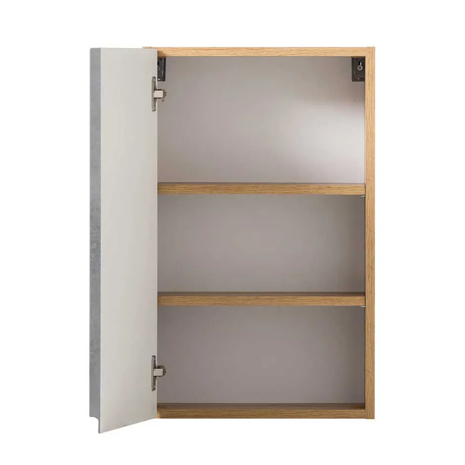 Das exklusive Badmöbel-Set „Mia“ aus unserem Hause vereint moderne Eleganz mit der Unvergänglichkeit deutscher Handwerkskunst. Ein Hängeschrank, ein Midischrank, ein Spiegelschrank, ein Unterschrank und ein Waschbeckenunterschrank bilden zusammen ein Ensemble, das nicht nur optisch beeindruckt, sondern auch in Sachen Funktionalität keine Wünsche offenlässt. Die klare Linienführung und die matte betongraue Farbgebung der Fronten, tiefgezogen und sorgfältig foliert, stehen im reizvollen Kontrast zur natürlichen Wärme der Korpusse in Wildeichenholzoptik. Diese sind nicht nur melaninbeschichtet, um Schutz und Langlebigkeit zu garantieren, sondern auch, um ein Stück Natur in Ihr Badezimmer zu bringen.
