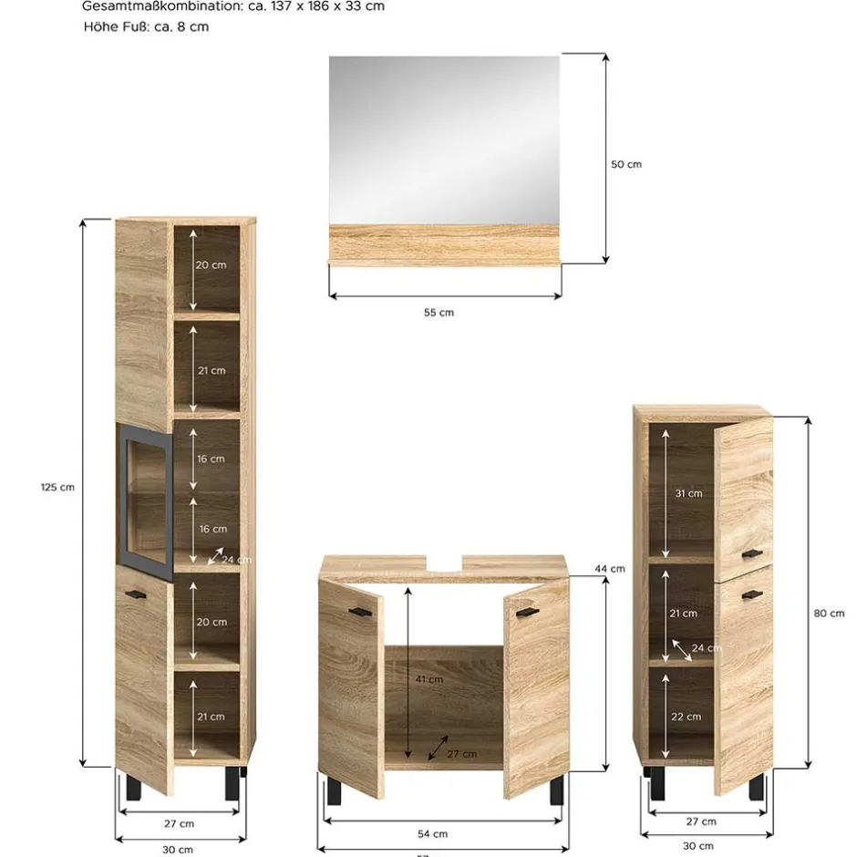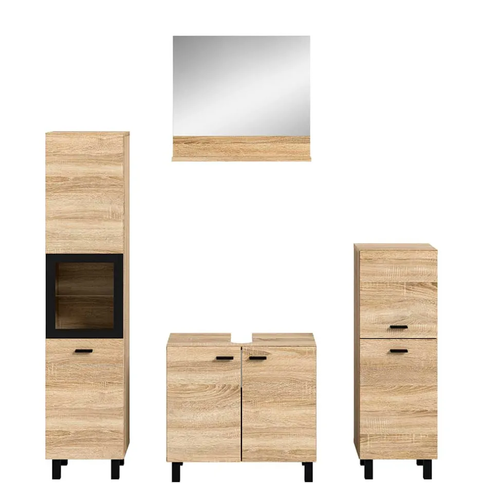 Das Badmöbelset „Hoxtona“ vereint moderne Ästhetik mit praktischer Funktionalität. In der warmen Holzoptik Sonoma Eiche gehalten, bringt es eine natürliche und zugleich elegante Atmosphäre in Ihr Badezimmer. Das vierteilige Set bietet durchdachte Lösungen für die Organisation und Gestaltung Ihres Badezimmers, während es sich harmonisch in verschiedene Einrichtungsstile einfügt.