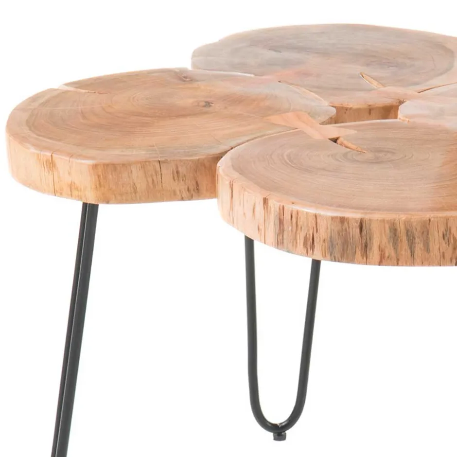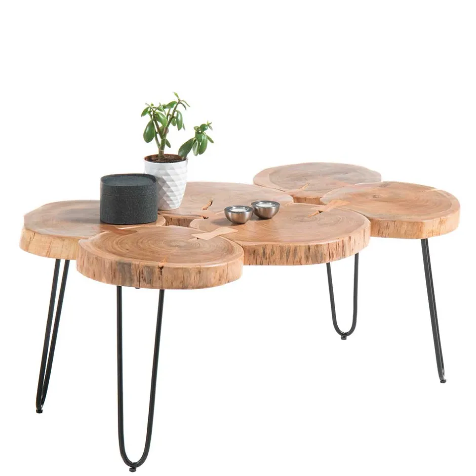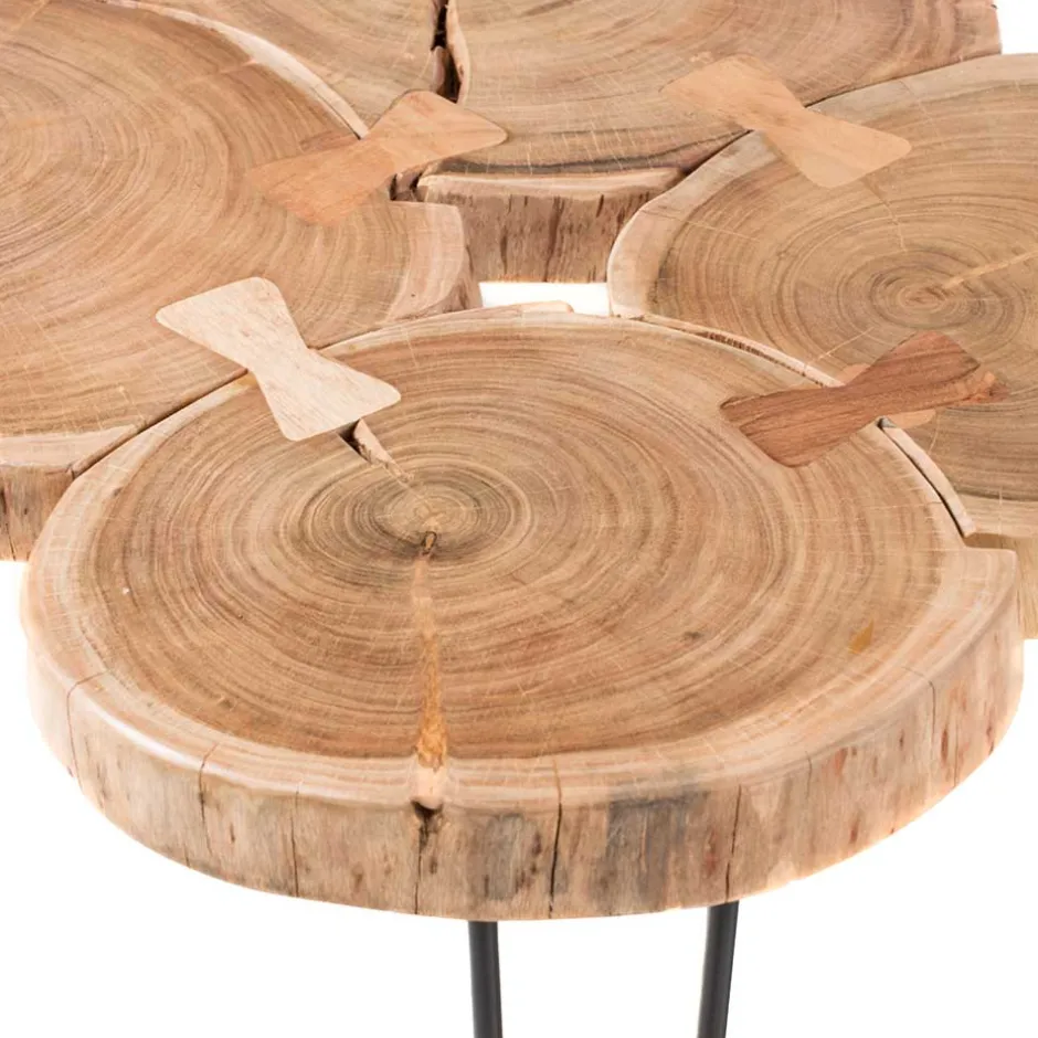 - Tischplatte besteht aus sechs Scheiben eines Baumstammes mit dekorativen Schwalbenschwanzverbindungen