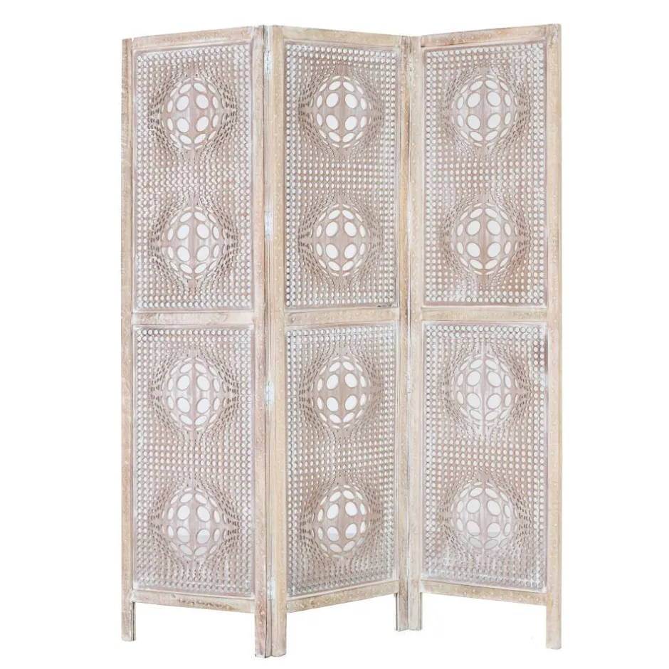 Der Paravent „Siao“ vereint kunstvolle Handwerkskunst mit einem Hauch von Bohème-Flair. In sanftem Altweiß gehalten und mit filigranen Ornamentmustern verziert, fügt er sich harmonisch in verschiedene Wohnstile ein. Ob als dekorativer Raumteiler, Sichtschutz oder stilvolles Accessoire – dieses Schmuckstück bringt Leichtigkeit und Charme in Ihre Räume. Durch die liebevolle Handbearbeitung ist jedes Exemplar ein Unikat, wodurch Ihr Zuhause eine ganz persönliche Note erhält.