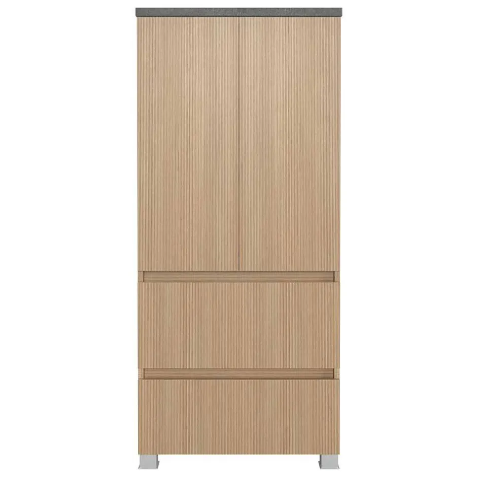 Mit einer Breite von 60 cm, einer Höhe von 131 cm (136 cm mit Füßen) und einer Tiefe von 35 cm bietet der Midischrank großzügigen Stauraum, ohne dabei sperrig zu wirken. Dank seines durchdachten Designs fügt er sich mühelos in verschiedene Raumkonzepte ein.