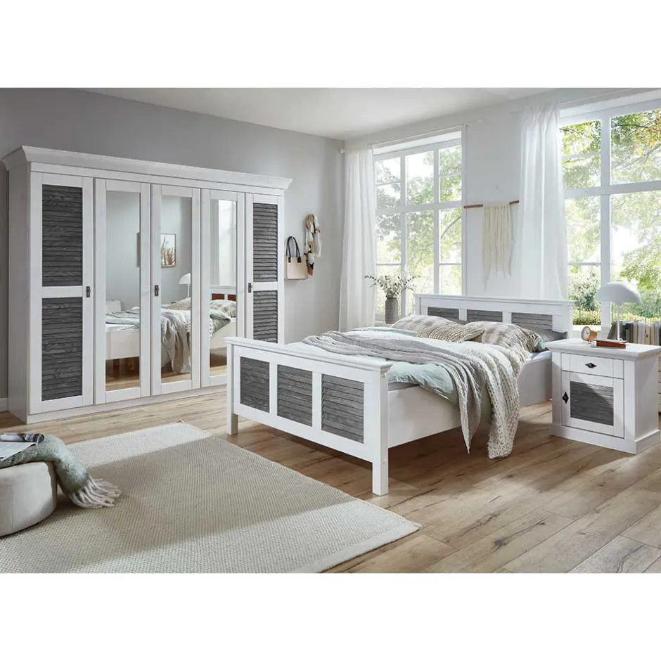 Entfliehen Sie dem Alltag und tauchen Sie ein in eine Welt der Ruhe und Harmonie mit dem Schlafzimmer-Set „Urezzas.“ Im eleganten Landhausstil gehalten, strahlt dieses Set Gemütlichkeit und Wärme aus. Die weißen und grauen lackierten Oberflächen harmonieren wunderbar mit der durchscheinenden Holzmaserung, die eine natürliche Note in Ihr Schlafzimmer bringt.