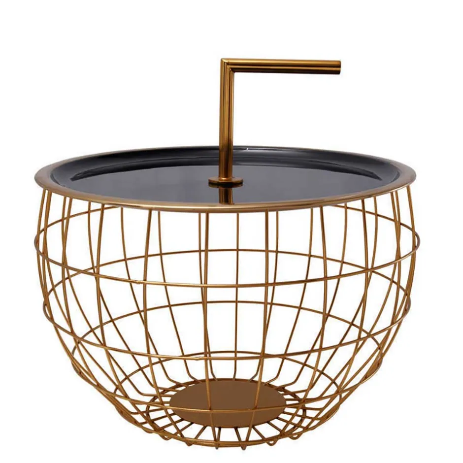 Der Design Beistelltisch „Egeass“ kombiniert innovative Formgebung mit einer stilvollen Materialwahl. Seine runde, abgesenkte Tischplatte in glänzendem Schwarz setzt einen eleganten Akzent, während das filigrane Drahtgestell in Gold für einen edlen und luftigen Look sorgt.