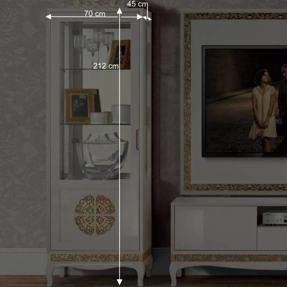 Eingehüllt in eine weiße, matte Lackierung erstrahlt die Wohnwand „Valganios“ in schlichter Eleganz. Teilweise zieren florale Muster die Oberfläche, die mit einer plastischen Struktur hervorgehoben und mit echtem Blattgold veredelt sind – ein Statement von Luxus und Raffinesse.
