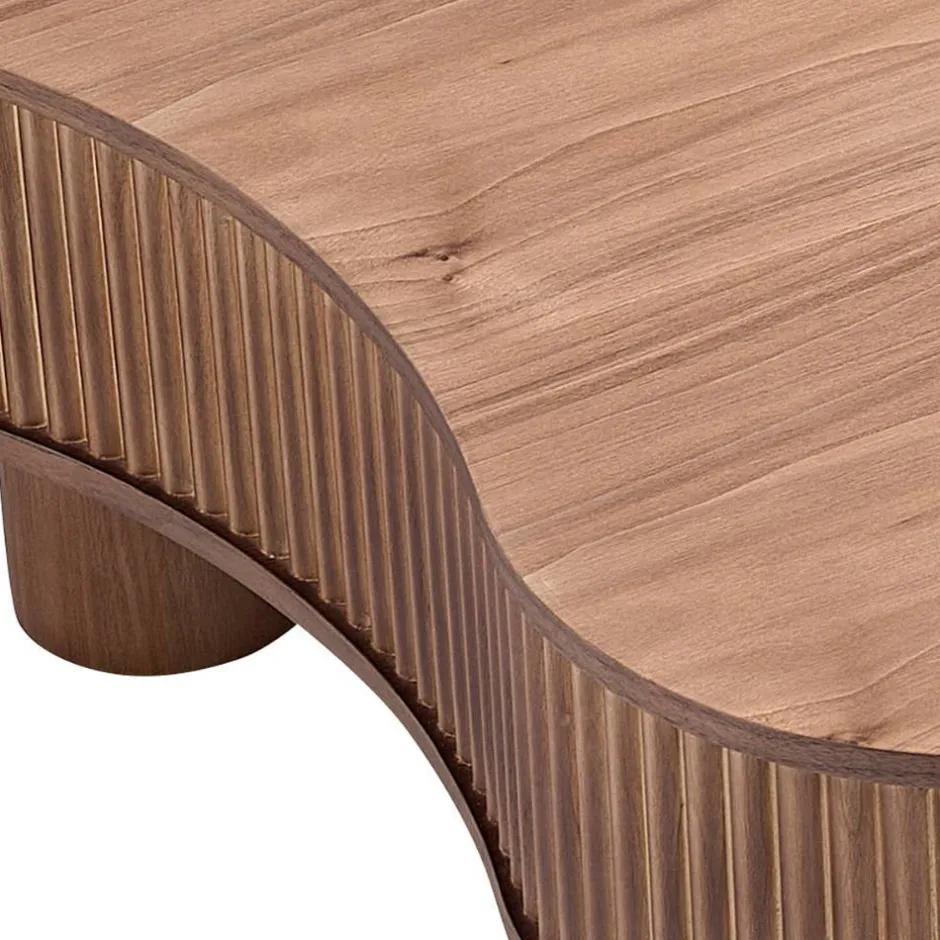 Gefertigt ist der Tisch aus MDF, einem robusten Holzwerkstoff, der für seine Formstabilität und langlebige Qualität geschätzt wird. Seine Oberfläche ist mit einem Holzfurnier versehen und in Walnussbraun lackiert – so entsteht ein natürlicher Look, der die Maserung des Holzes sichtbar macht und dem Tisch Tiefe sowie Charakter verleiht. Ein besonderer Blickfang sind die rund 15 cm hohen Außenkanten der Tischplatte: Hier setzen vertikal angebrachte Lamellen aus Massivholz, ebenfalls in Walnussbraun lackiert, reizvolle Akzente, die die organische Form des Möbelstücks unterstreichen.