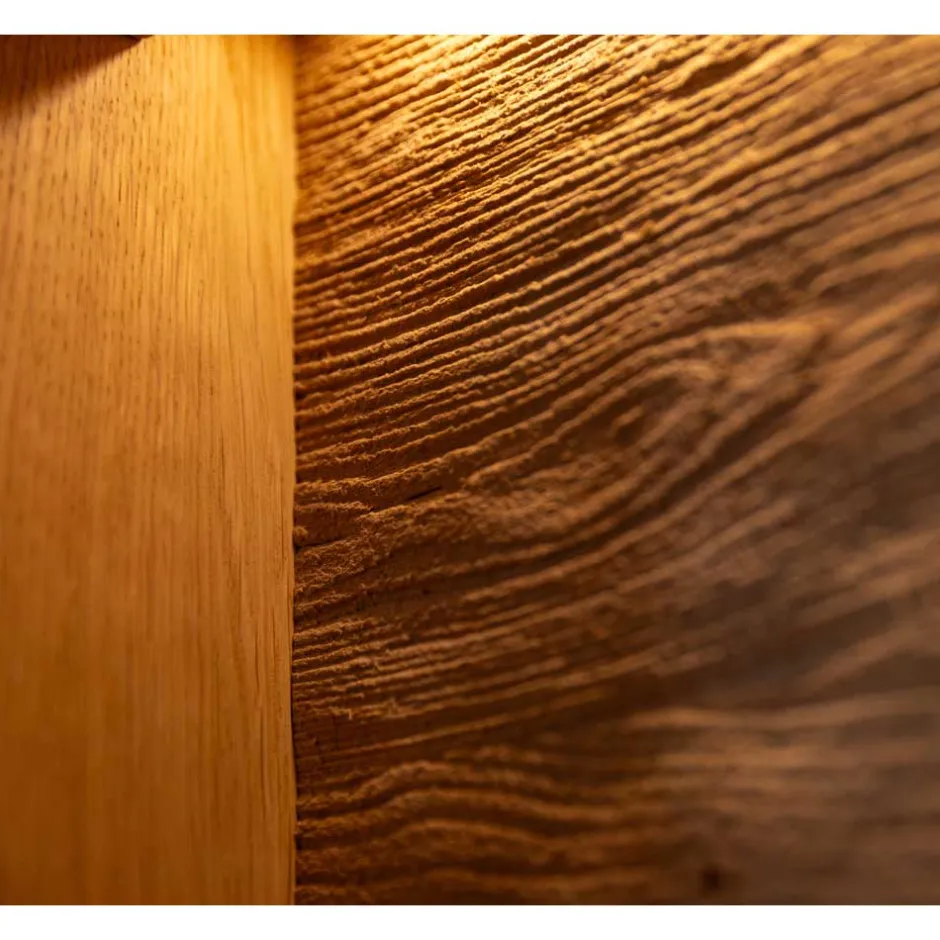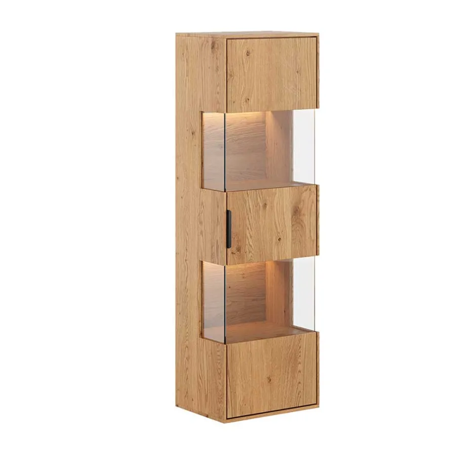 Die Hängevitrine „Judita“ überzeugt durch eine Kombination aus massivem Eichenholz und Glaselementen, die sorgfältig verarbeitet wurden. Die Glassegmente in der Tür und an den Seitenwänden sorgen für eine dezente Transparenz und setzen Ihre Lieblingsstücke gekonnt in Szene. Der dezente Kantengriff aus schwarzem Metall ergänzt das Design stilvoll, während die sichtbare Rückwand mit 3D-Struktur das Gesamtbild abrundet. Eine indirekte LED-Beleuchtung mit Touchschalter sorgt für stimmungsvolle Lichtakzente und ist zudem energieeffizient.