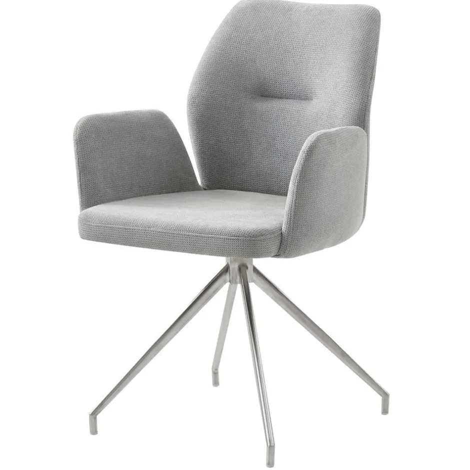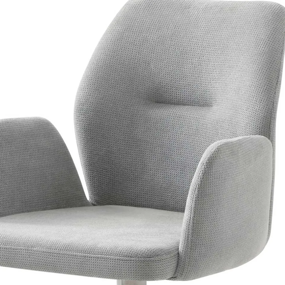 Die vier Armlehnenstühle ergänzen den Tisch ideal und setzen mit ihrem hellgrauen Bezug einen modernen Kontrast. Der strapazierfähige Webstoff mit feiner Struktur sorgt nicht nur für eine angenehme Haptik, sondern überzeugt auch durch seine hohe Lichtbeständigkeit sowie eine außergewöhnliche Abriebfestigkeit von 50.000 Scheuertouren nach Martindale. Das bedeutet: Auch nach längerer Nutzung bleibt der Stoff schön und widerstandsfähig.