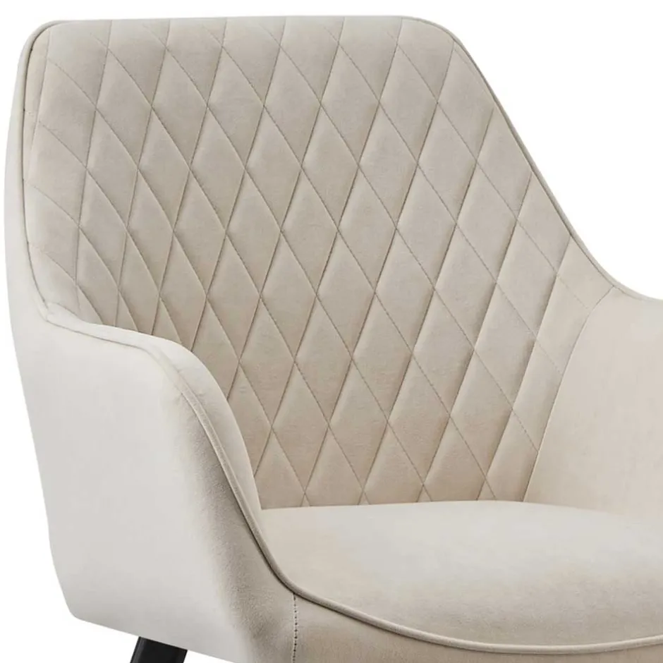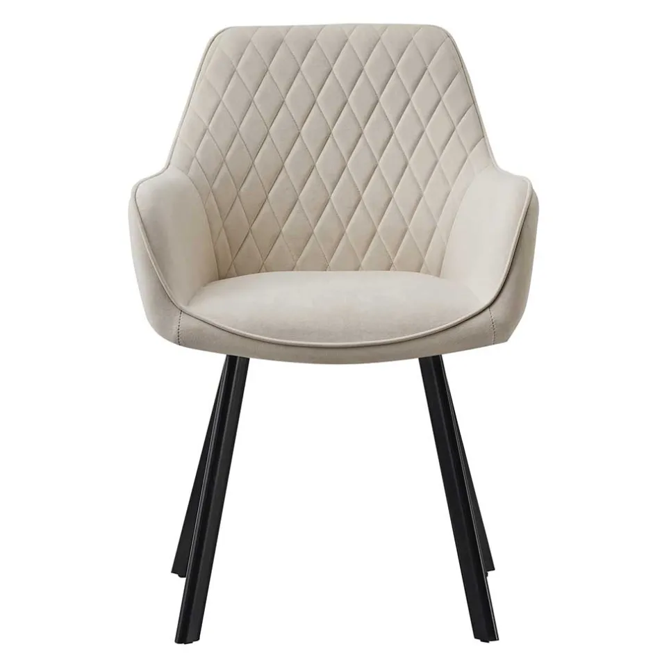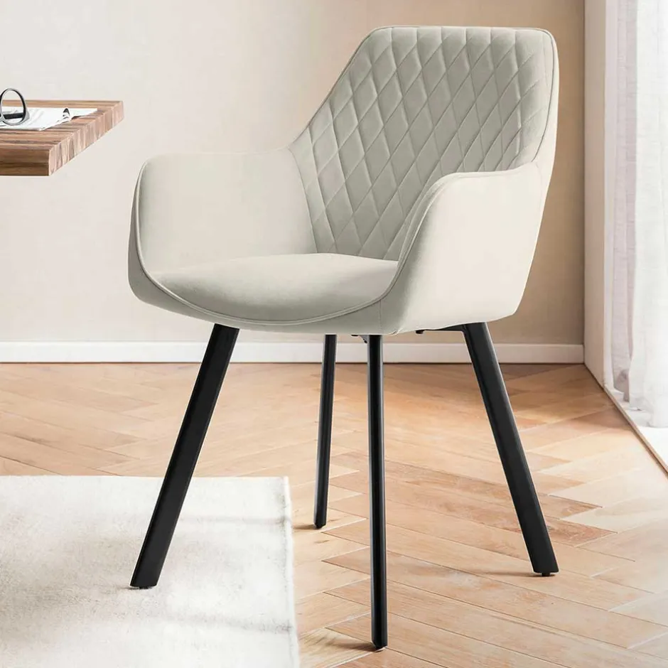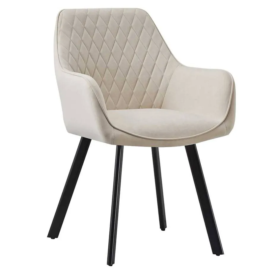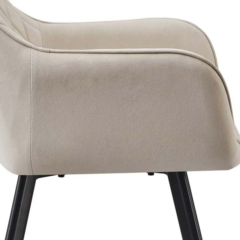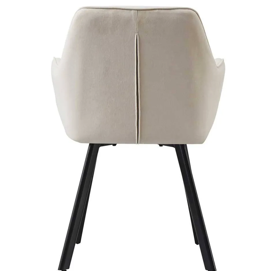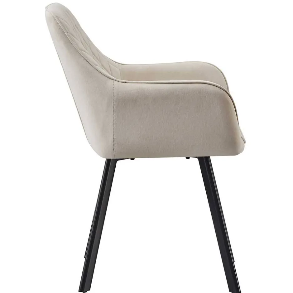 Angenehm leicht ausgestellte Armlehnen mit einer Höhe von 63 cm unterstützen entspanntes Zurücklehnen und laden zum gemütlichen Verweilen ein. Sitzhöhe (46 cm), Sitzbreite (41 cm) und Sitztiefe (42 cm) wurden so gewählt, dass Komfort und Bewegungsfreiheit ideal miteinander harmonieren. Für höchste Stabilität sorgt ein abgeschrägtes Vierfußgestell aus schwarz pulverbeschichtetem Metall. Die Pulverbeschichtung schützt die Oberfläche dauerhaft vor Kratzern, Korrosion und Abnutzung und verleiht den Stühlen einen modernen, matten Look, der hervorragend mit dem beigen Samt harmoniert. Jeder Stuhl trägt bis zu 110 kg – ein klares Zeichen für die hohe Verarbeitungsqualität.