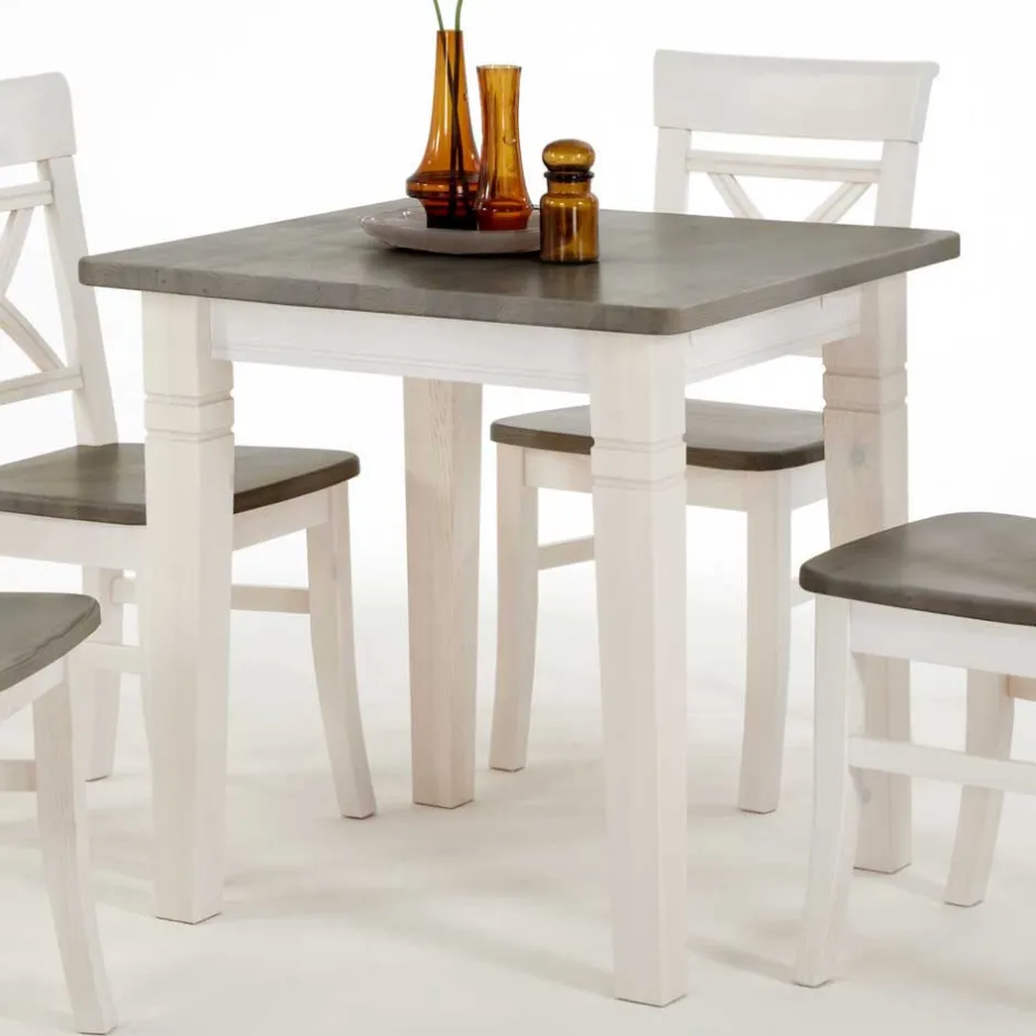 Die Esstischgruppe Yoan besteht aus einem quadratischen Esstisch und vier stilvollen Stühlen – ideal für kleine Räume oder gemütliche Essbereiche. Der Tisch misst 78×78 cm und bietet ausreichend Platz für vier Personen. Dank der soliden Tischplattenstärke von 3 cm und des stabilen Vierfußgestells mit dekorativen Fräsungen steht er fest und sicher. Abgerundete Tischkanten sorgen für ein angenehmes Gefühl und zusätzlichen Komfort.