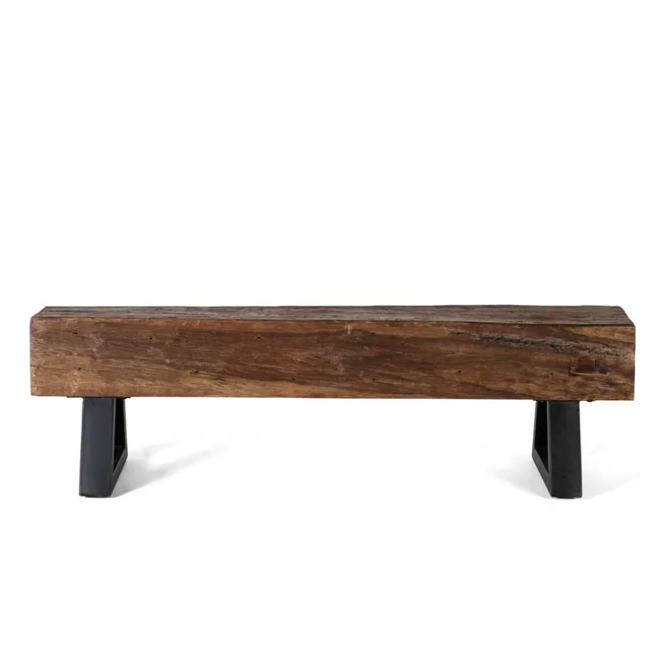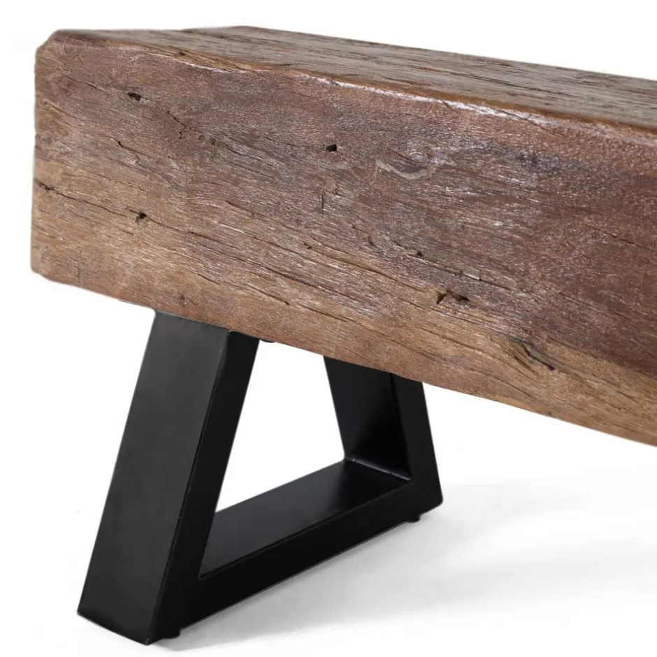 Für den sicheren Stand sorgen zwei markante Metall-Bügelbeine im Triangeldesign, die in edlem Schwarz lackiert sind. Dieses geometrische Untergestell verleiht der Bank nicht nur hohe Stabilität, sondern auch eine moderne, industrielle Note, die perfekt mit der Natürlichkeit des Holzes harmoniert. Die prägnante Formensprache macht „Evinele“ zu einem Möbelstück, das zugleich robust und elegant wirkt.