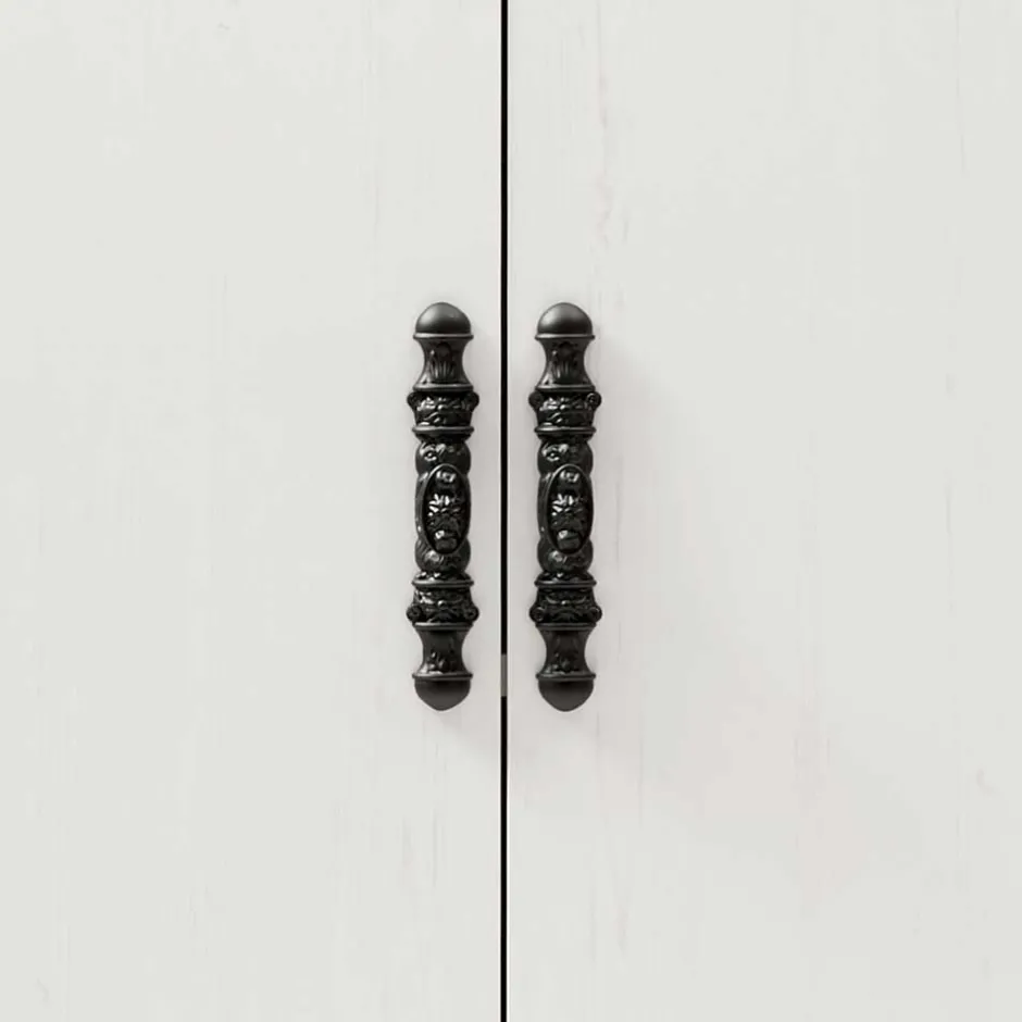 - Schwarze Metallgriffe mit antik anmutenden Verzierungen