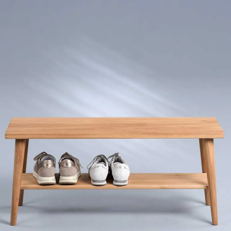 Die Garderobenbank „Liorys“ ist aus massiver Wildeiche gefertigt und verfügt über eine geölte Holzoberfläche. Das schräge Vierfußgestell sorgt für einen sicheren Stand und Stabilität.