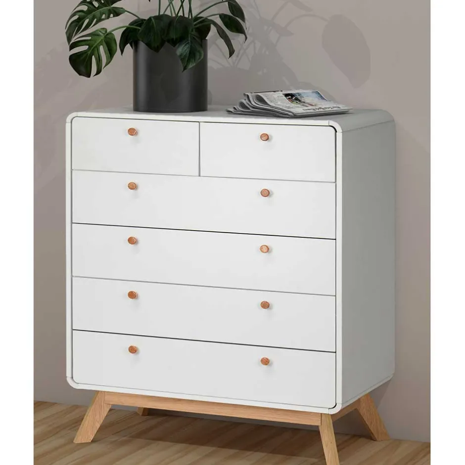 Die leicht schräg gestellten Beine in Eichenholzoptik setzen einen ansprechenden Kontrast zur weißen Oberfläche und verleihen der Kommode ihren charmanten skandinavischen Charakter. Sie sorgen zudem für eine angenehme Höhe und eine luftige Leichtigkeit, die den Raum optisch vergrößert.