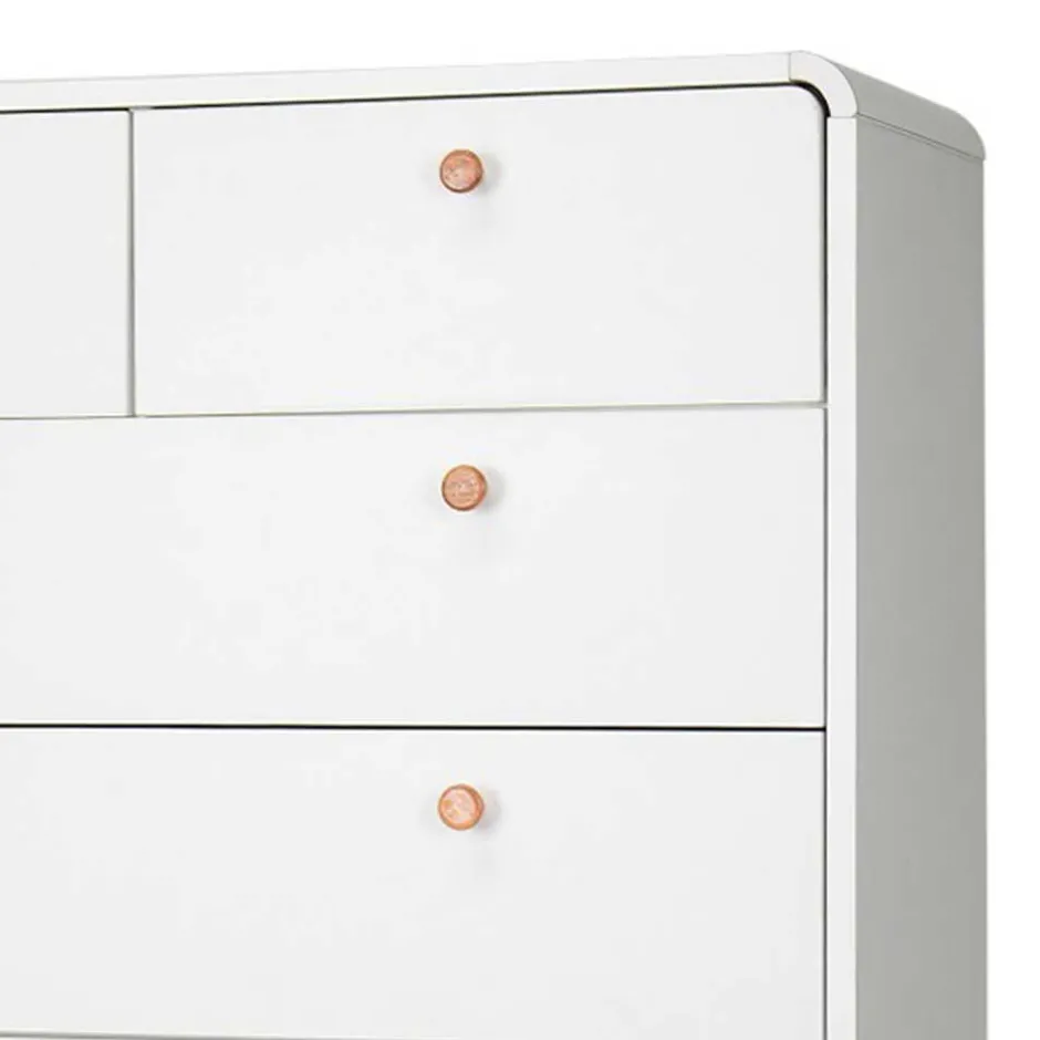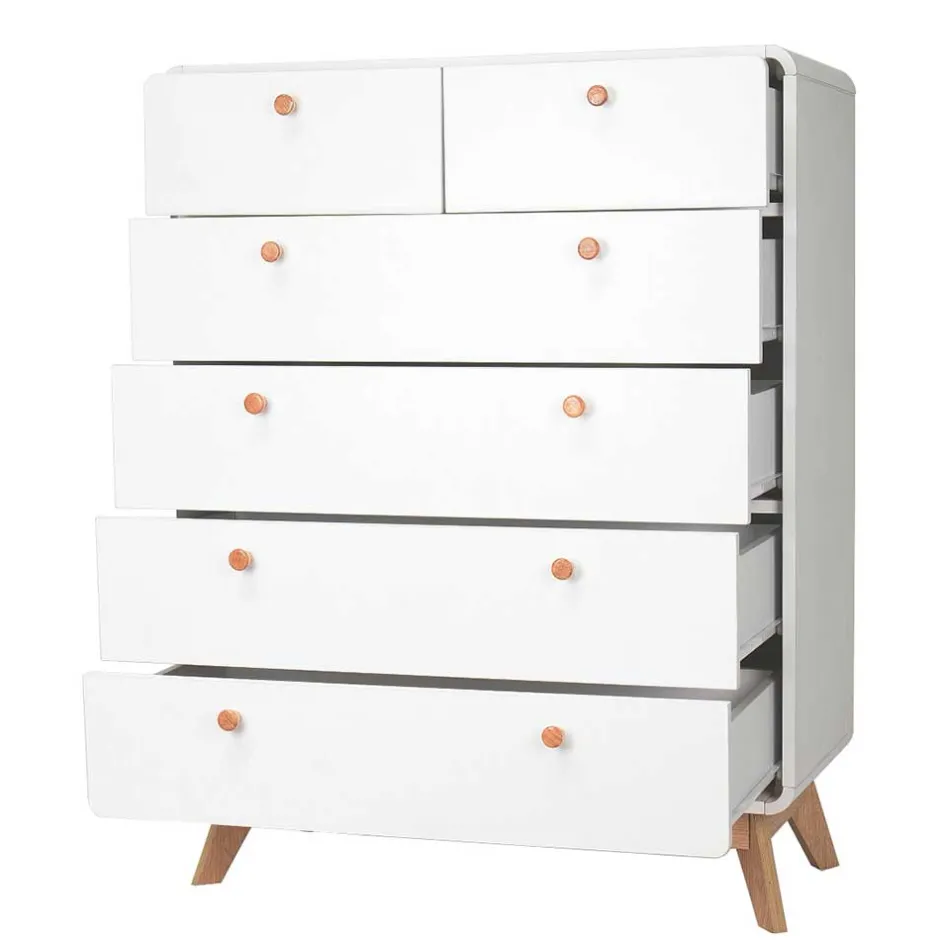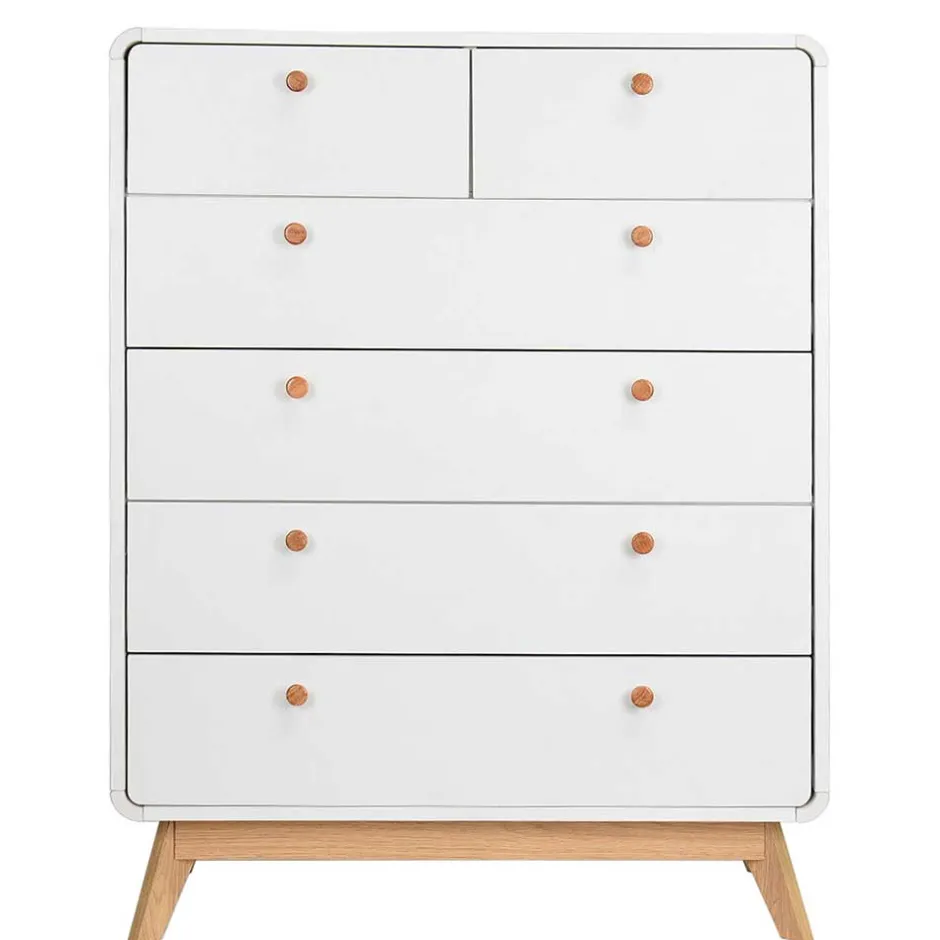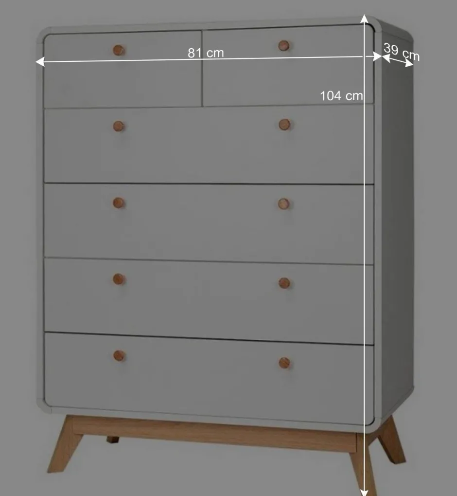 Mit einer Breite von 81 cm, einer Höhe von 104 cm und einer Tiefe von 39 cm bietet die Kommode „Kolreva“ jede Menge Platz für Ihre persönlichen Dinge. Sechs geräumige Schubladen mit leichtgängigen Metallauszügen sorgen dafür, dass alles ordentlich verstaut werden kann – sei es Kleidung, Dokumente oder andere Alltagsgegenstände. Die runden Holz-Knopfgriffe unterstreichen den natürlichen Look und ermöglichen ein komfortables Öffnen und Schließen der Schubladen.