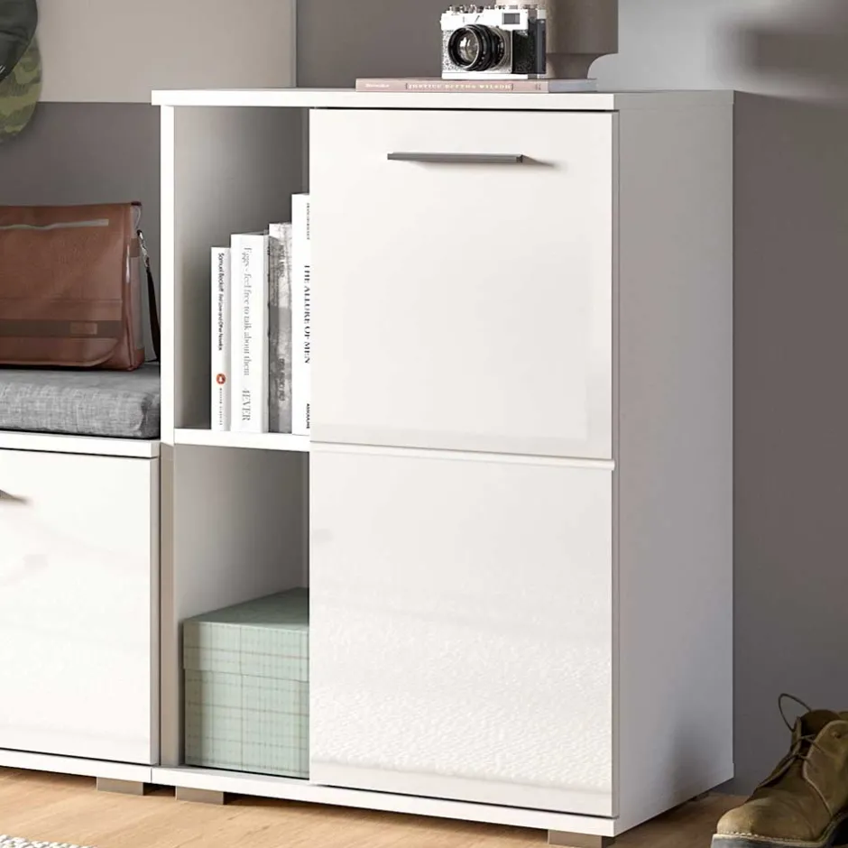 Klare Linien, eine harmonische Farbgestaltung und eine hochwertige Verarbeitung machen den Schuhschrank „Rugova“ zu einem echten Hingucker. Der Korpus in mattem Weiß strahlt Ruhe und Schlichtheit aus, während die hochglänzende Front mit ihrer feinen Rillenoptik eine moderne Dynamik hinzufügt. Das Zusammenspiel dieser Oberflächen erzeugt einen zeitlosen Look, der sich nahtlos in verschiedene Einrichtungsstile einfügt – von puristisch-modern bis hin zu wohnlich-gemütlich. Die reflektierende Wirkung der hochglänzenden Front sorgt zudem dafür, dass Ihr Raum größer und heller wirkt.