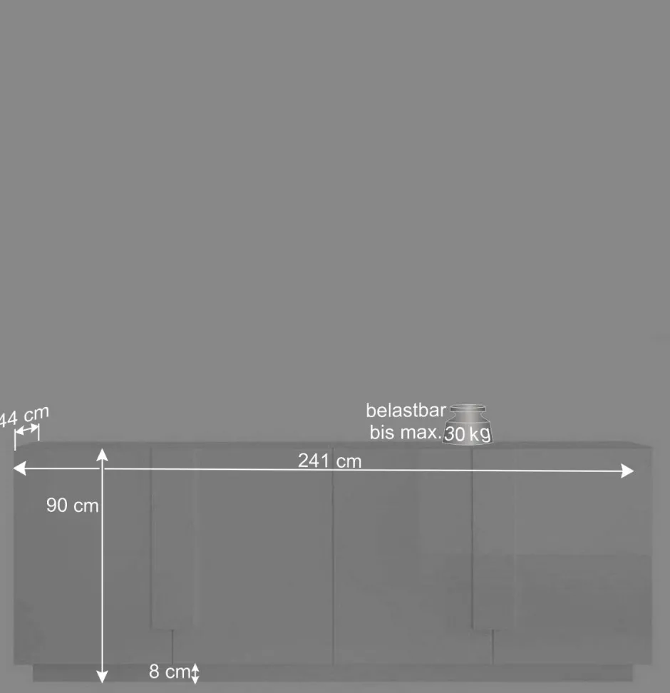 Mit einer beeindruckenden Breite von 241 cm, einer Höhe von 90 cm und einer Tiefe von 44 cm bietet das Sideboard „Kerym“ enorm viel Stauraum. Hinter den vier Türen, die mit einer Soft-Close-Funktion und hochwertigen Metallbeschlägen ausgestattet sind, verbergen sich vier Einlegeböden. Jeder Einlegeboden ist bis zu 10 kg belastbar, sodass Sie problemlos Bücher, Geschirr oder andere Haushaltsgegenstände verstauen können. Die Soft-Close-Funktion sorgt dafür, dass die Türen sanft und leise schließen, was die Lebensdauer des Möbelstücks zusätzlich verlängert.