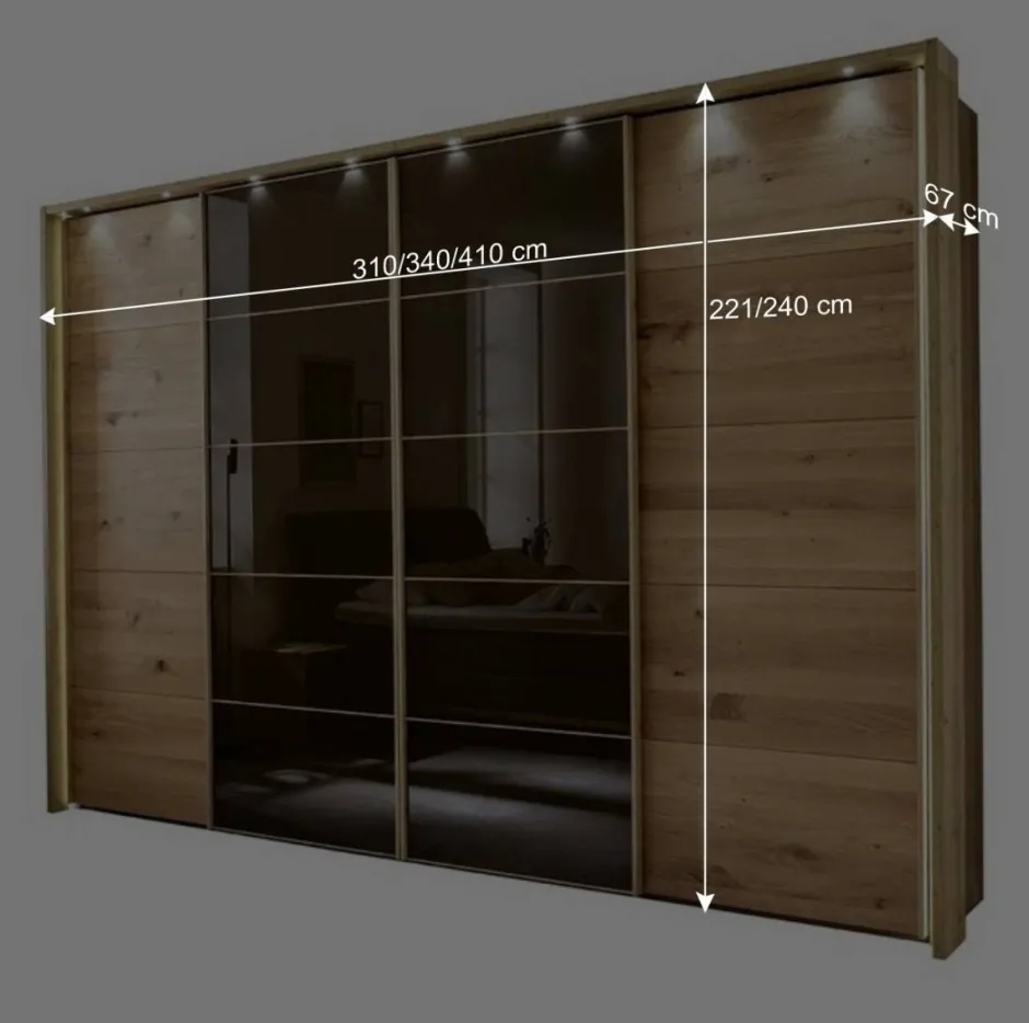 Die vier Schwebetüren mit Synchron-Öffnung ermöglichen ein leichtes und synchrones Öffnen und Schließen der Türen, ideal für Räume mit begrenztem Platzangebot. Die äußeren beiden Türfronten bestehen aus massivem Eichenholz, während die mittleren beiden Türfronten mit stilvollem, dunkelbraunem Glas beschichtet sind. Die langen Metallgriffleisten in Korpusfarbe unterstreichen das moderne Design und erleichtern die Handhabung.