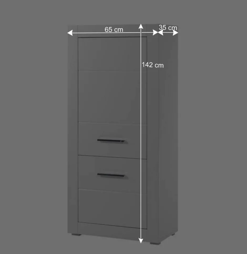 Mit einer Breite von 65 cm, einer Höhe von 142 cm und einer Tiefe von 35 cm fügt sich der Schrank harmonisch in verschiedenste Wohnsituationen ein – ob im Wohnzimmer, Flur oder Schlafzimmer. Trotz seiner schlanken Maße bietet er erstaunlich viel Stauraum und trägt durch sein helles, glänzendes Finish dazu bei, Räume größer und freundlicher wirken zu lassen.