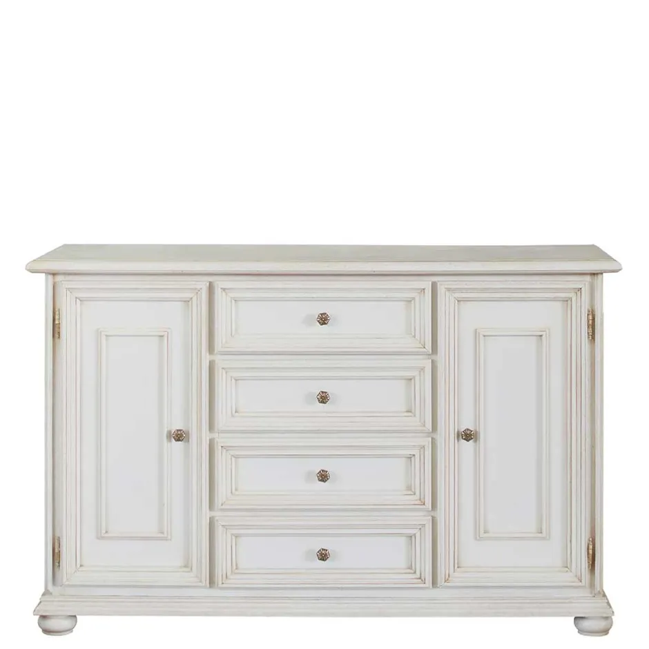 Die aufwändige Kassettenoptik und die feinen Zierfräsungen verleihen der Kombi-Kommode eine edle Ausstrahlung. Ergänzt durch goldfarbene Metall-Knopfgriffe und kunstvoll gedrechselte Holzfüße, unterstreicht jedes Detail den klassischen Stil dieses Möbelstücks.