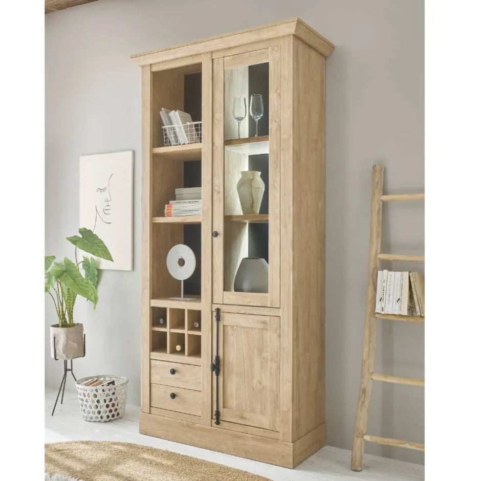 Die TV-Anbauwand „Hengas“ besteht aus einem Lowboard, einer Vitrine und einem Wandboard – perfekt aufeinander abgestimmt und funktional durchdacht. Das große Lowboard (194 x 55 x 42 cm) bietet zwei Drehtüren mit großzügigem Stauraum und drei offene Gerätefächer für Ihre Unterhaltungselektronik. Darüber sorgt das Wandboard (150 x 20 x 17 cm) mit einer 138 cm breiten Ablagefläche für zusätzlichen Platz zur Präsentation Ihrer Lieblingsdekoration. Der stilvolle Vitrinenschrank (105 x 214 x 42 cm) komplettiert das Ensemble mit einer gelungenen Mischung aus offenen und geschlossenen Fächern: Drei offene Fächer, sechs Flaschenfächer für 0,7-l-Flaschen, zwei Schubladen mit Vollauszug und eine große Glastür bieten Platz für Geschirr, Gläser und Accessoires. Hinter der unteren Holztür befindet sich ein weiterer Stauraum – so behalten Sie stets den Überblick.