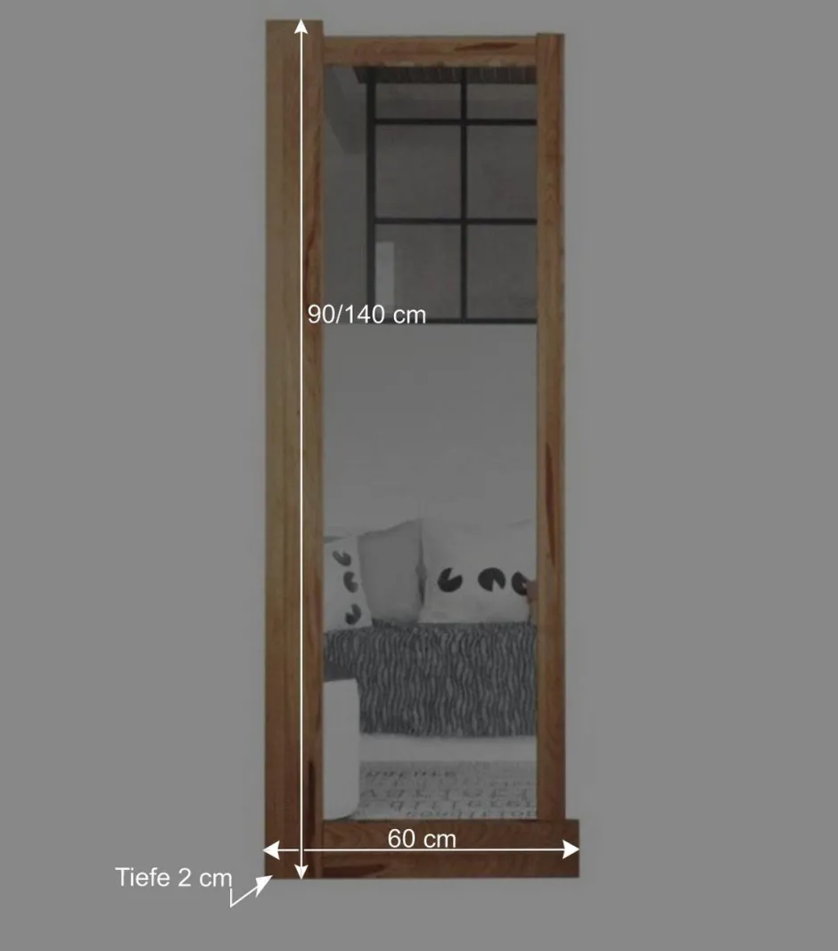 Der Spiegel, ausgestattet mit einem markanten Holzrahmen, misst ca. 60x140x2 cm und kann sowohl vertikal als auch horizontal aufgehängt werden. Er vervollständigt das Ensemble mit einer Prise Eleganz.