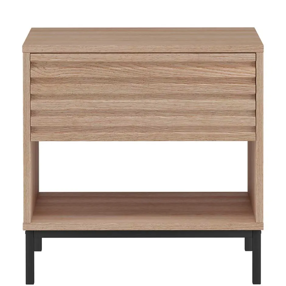 Die Nachtkommode „Lunira“ überzeugt mit einem durchdachten Stauraumkonzept. Eine geräumige Schublade mit leichtgängiger Metallauszug-Schiene und praktischer Push-to-Open-Funktion bietet Platz für persönliche Gegenstände, die Sie griffbereit aufbewahren möchten. Die Front der Schublade wird durch horizontale Rillen stilvoll in Szene gesetzt. Direkt darunter befindet sich ein offenes Fach, das zusätzlichen Platz für Bücher, Dekoration oder andere Alltagsgegenstände bietet – und das ganz ohne Rückwand für eine besonders luftige Optik.