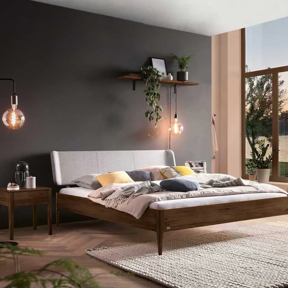 - Harmonisches Bett in Nussbaumfarben und Grau