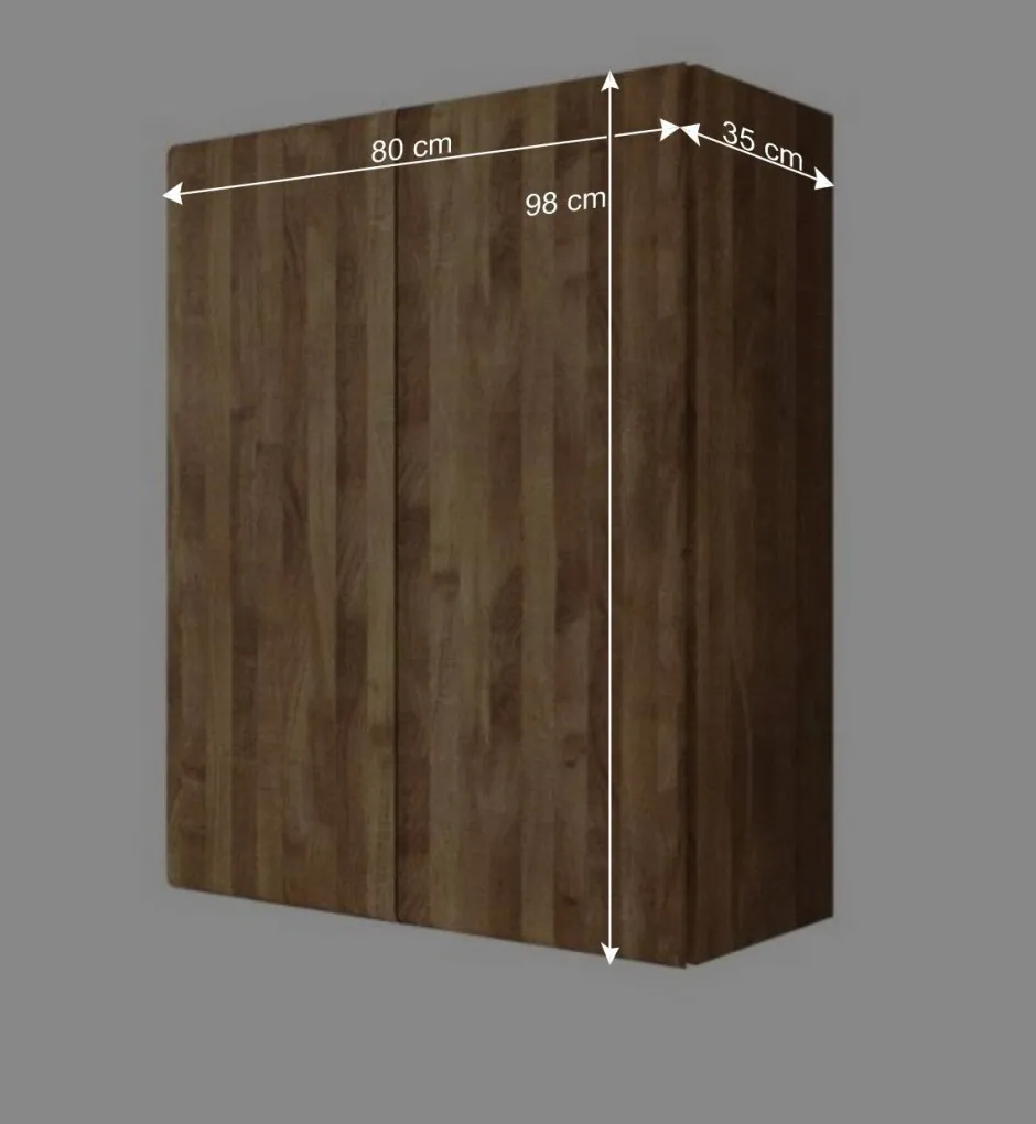 Mit einer Breite von 80 cm, einer Höhe von 98 cm und einer Tiefe von 35 cm bietet der Oberschrank „Vaskov“ großzügigen Stauraum auf kompakter Fläche. Die Oberplatte mit einer Stärke von 2 cm unterstreicht die solide Konstruktion. Hinter den zwei Drehtüren verbergen sich zwei durchgehende Einlegeböden, die Fächer mit Innenmaßen von je ca. 75x27x27 cm schaffen. Hier findet alles seinen Platz, von Geschirr über Gläser bis hin zu Küchenutensilien.