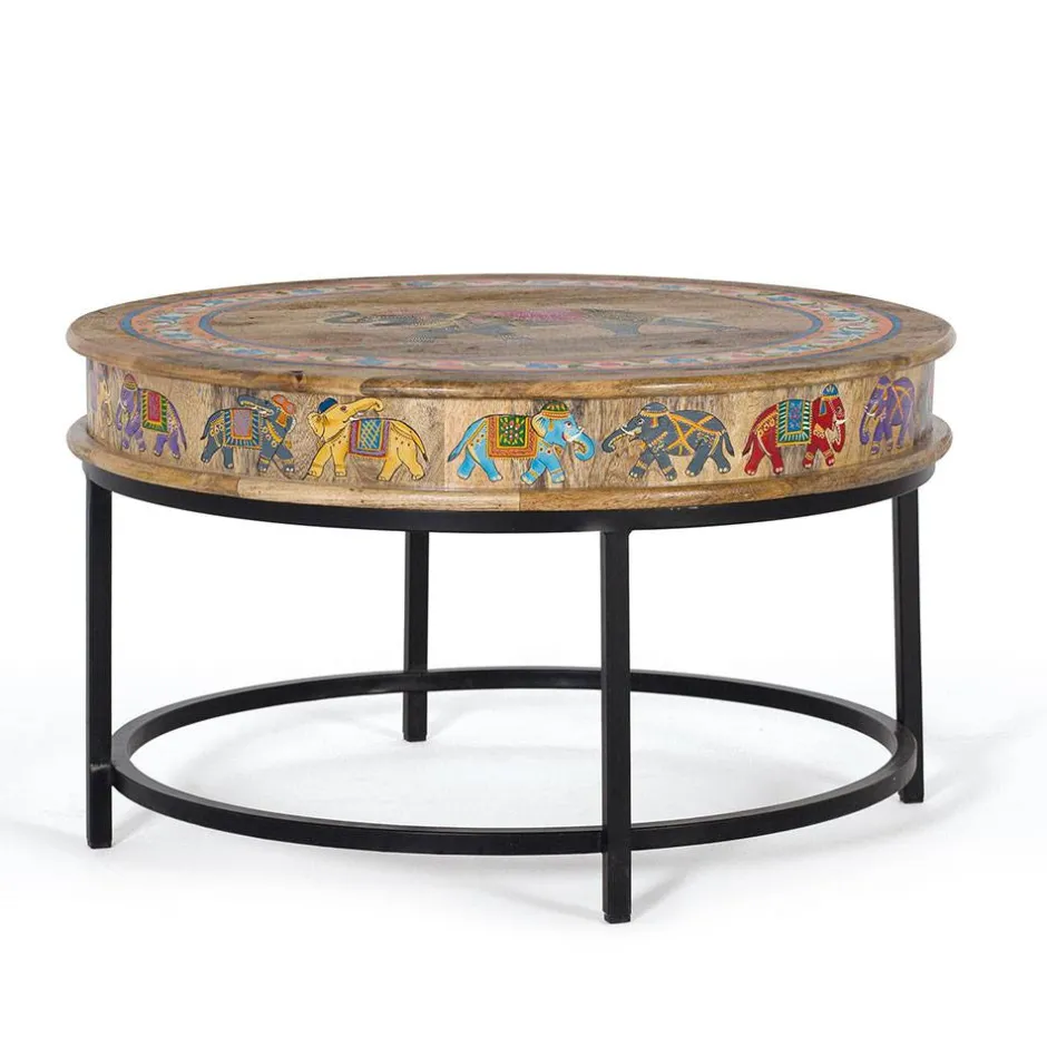 Das absolute Highlight dieses Couchtischs sind die kunstvollen, handbemalten Elefanten-Motive in satten, kräftigen Farben. Jedes Detail wurde mit Liebe zum Handwerk gestaltet und anschließend versiegelt, um die strahlenden Farben dauerhaft zu erhalten. Durch diese aufwendige Bearbeitung ist jeder Tisch ein Einzelstück – keine zwei Exemplare sind exakt gleich.
