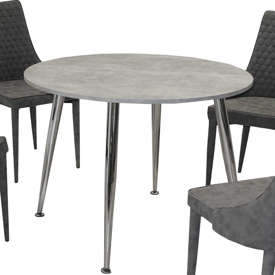 Verwendete Farbtöne verleihen dem Möbelstück eine besonders hochwertige Ausstrahlung. Dunkelgraue Sitzflächen sorgen für eine ruhige, edle Grundstimmung. In Kontrast dazu steht das verchromte Metall der Tisch- und Stuhlgestelle, das glänzende Akzente setzt und Leichtigkeit ins Design bringt. Ergänzt wird das Farbbild durch die folierte Tischplatte in authentischer grauer Beton-Optik – ein stilvoller Hingucker, der Moderne und Natürlichkeit miteinander verbindet.