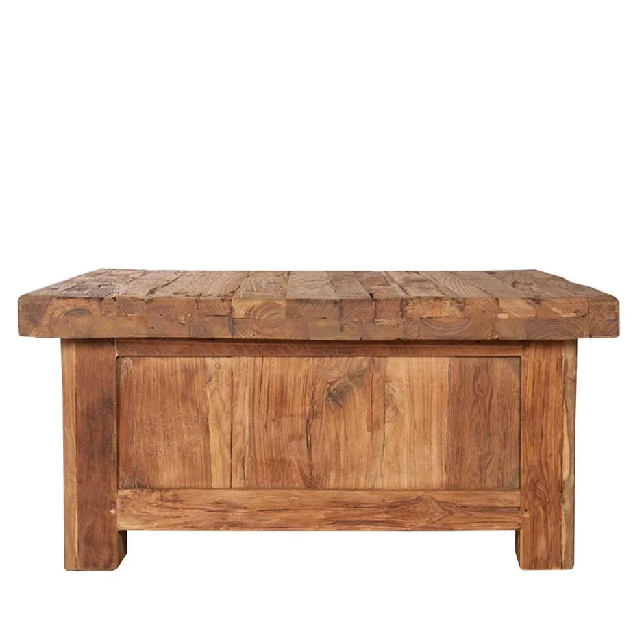 Der Couchtisch „Ragista“ wird aus recyceltem Teakholz in aufwendiger Handarbeit gefertigt. Das Holz hat über die Jahre eine natürliche Reife erlangt, wodurch es seinen warmen Farbton erhalten hat. Jede Unebenheit, jeder Einschluss und jede Delle erzählt eine Geschichte und unterstreicht die Natürlichkeit des Holzes. Die naturbelassene Oberfläche verleiht dem Tisch einen authentischen Charakter.