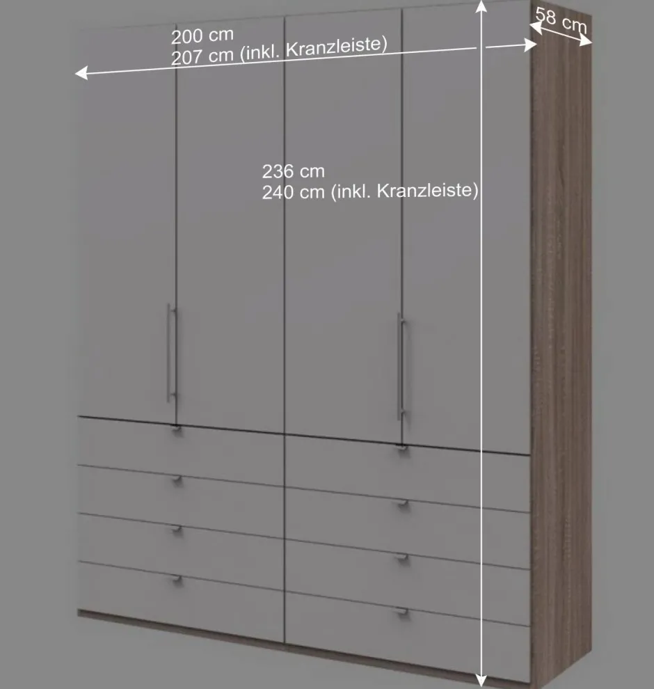 Mit Außenmaßen von 200 cm Breite, 58 cm Tiefe und 236 cm Höhe bietet der „Vaclyn“ jede Menge Stauraum für Ihre Kleidung und Accessoires. Er ist optional auch mit einem Passepartout-Rahmen erhältlich, der die Breite auf 207 cm und die Höhe auf 240 cm erweitert und dem Schrank eine noch edlere Optik verleiht.