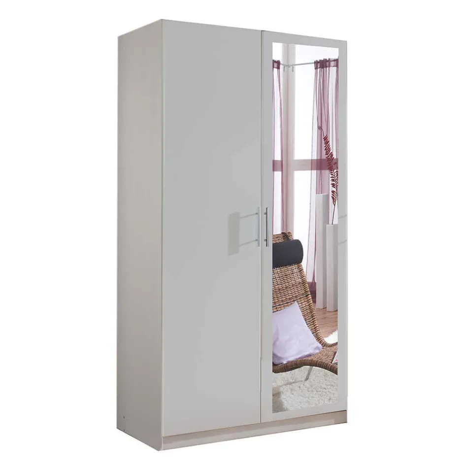 Die rechte Türfront des Schranks ist mit einem praktischen Ganzkörperspiegel ausgestattet. Dieser erleichtert Ihnen die tägliche Outfitwahl und spart gleichzeitig Platz, da kein zusätzlicher Spiegel im Raum notwendig ist. Die stabilen Metallbeschläge der Drehtüren sorgen für eine lange Lebensdauer und die handlichen, alufarbigen Kunststoff-Stangengriffe ermöglichen ein komfortables Öffnen und Schließen der Türen.