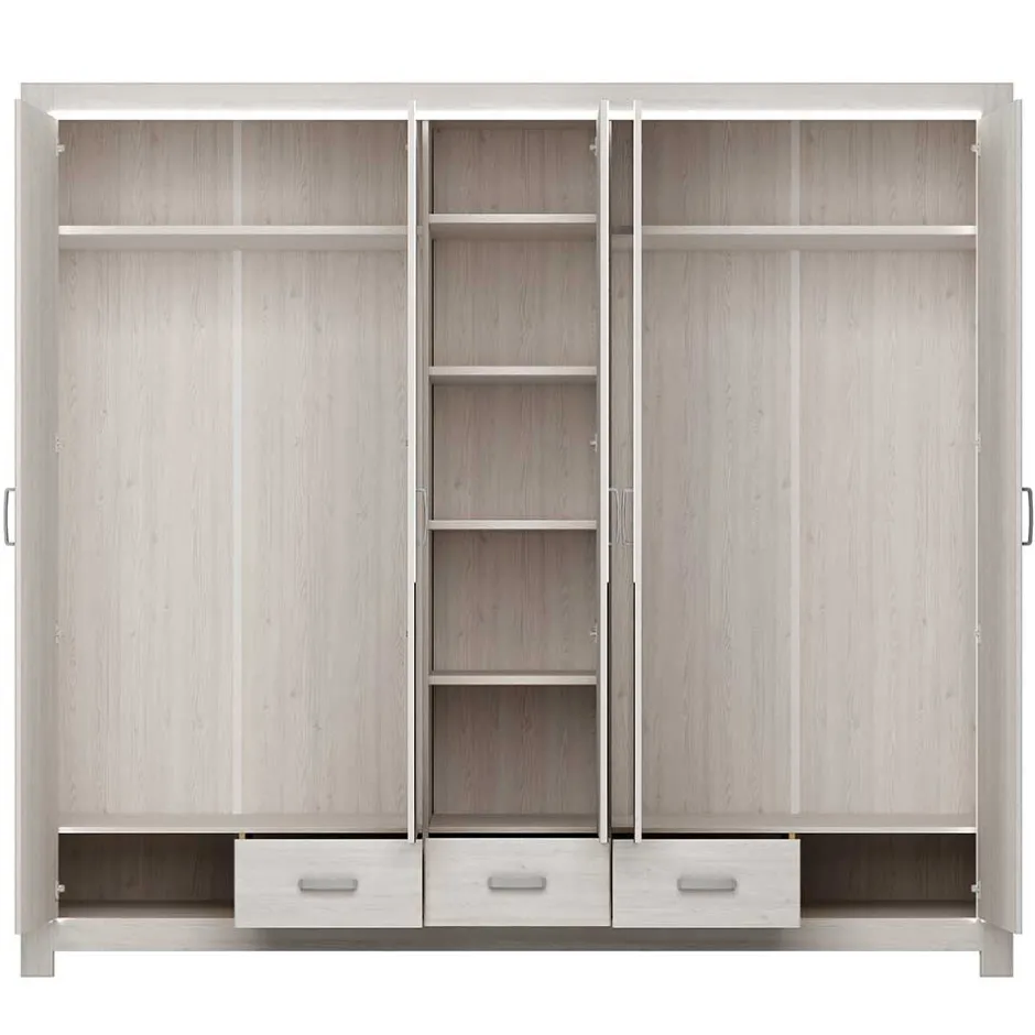 - Hinter der mittleren Tür fünf Einlegeböden, hinter den Doppeltüren außen jeweils ein Boden und eine Kleiderstange