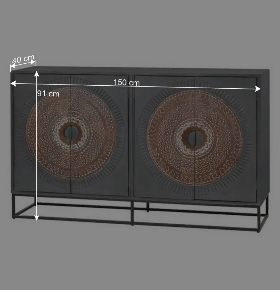 Das Sideboard „Mesusco“ ist ein faszinierender Blickfang, der Funktionalität und kunstvolles Design vereint. Mit seiner harmonischen Farbkomposition aus Grautönen, Brauntönen und markanten schwarzen Akzenten bringt es eine einladende und lebendige Atmosphäre in jeden Raum. Die aufwändigen Schnitzereien und handbemalten Oberflächen verleihen dem Möbelstück eine individuelle Note, die an orientalische Kunstwerke erinnert. Jedes Sideboard ist ein echtes Unikat, da Farbe, Form, Struktur und Maße leicht variieren können.