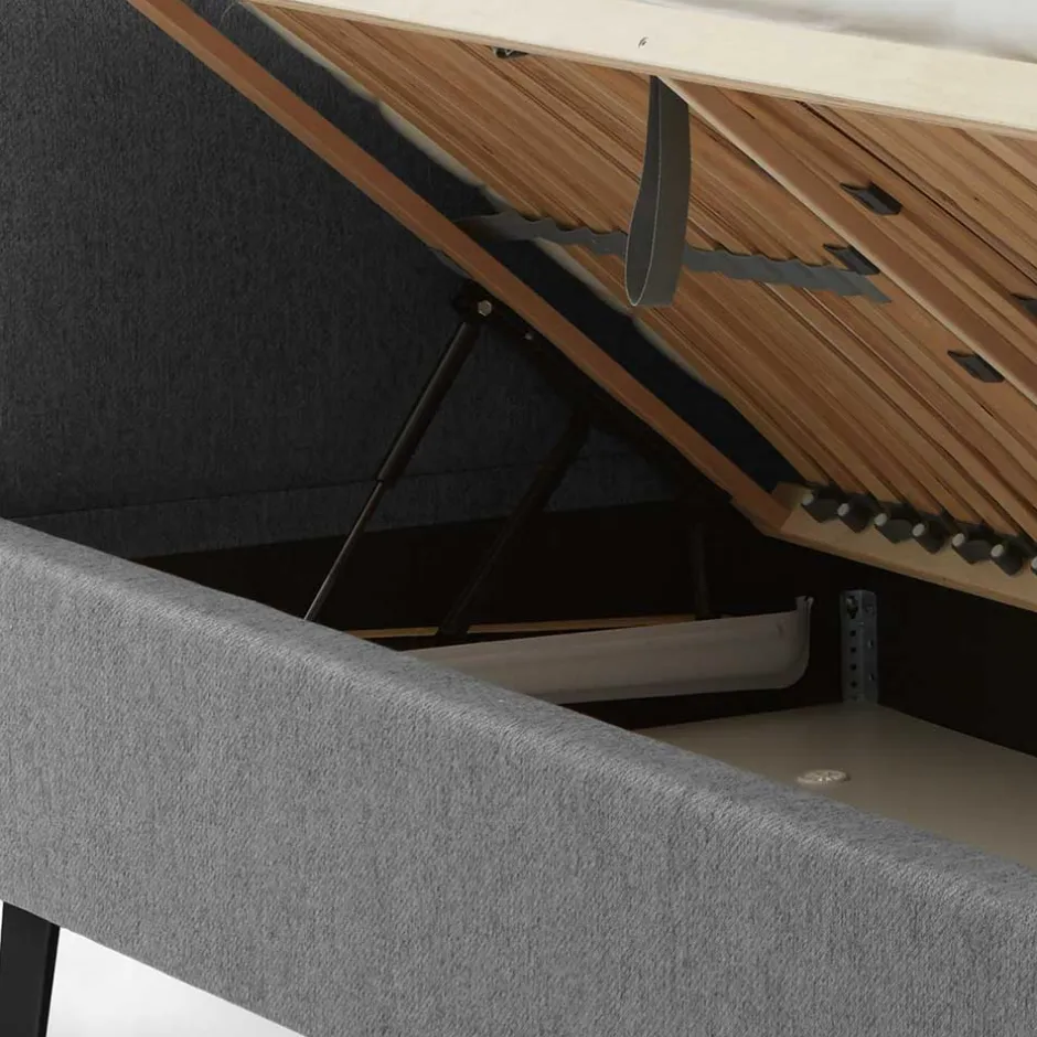 Optional kann das Polsterbett „Optica“ mit zwei unverstellbaren Lattenrosten und Bettkästen bestellt werden. Die Lattenroste bestehen aus 28 starren Leisten und sind im Härtegrad verstellbar, was Ihnen individuellen Schlafkomfort bietet. Mit einer Einlegetiefe von 13 cm für die Lattenroste wird eine optimale Matratzenintegration ermöglicht. Die seitlich zu öffnenden Bettkästen bieten praktischen Stauraum für Bettwäsche, Bettzeug und mehr.