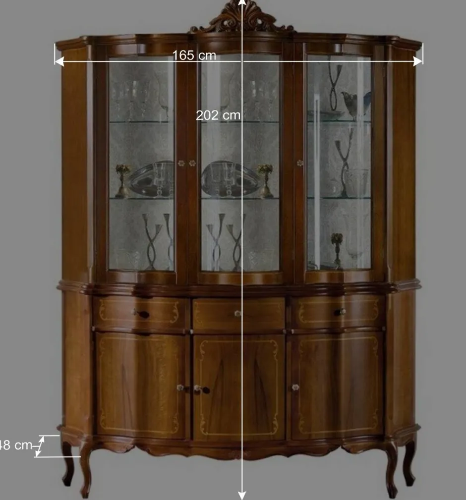Mit einer Breite von 165 cm, einer Höhe von 202 cm und einer Tiefe von 48 cm bietet „Arionn“ nicht nur eine elegante Optik, sondern auch viel Stauraum. Die drei Türen mit Glaseinsatz sind ideal, um Ihre edelsten Deko-Stücke und Porzellansammlungen zur Schau zu stellen, unterstützt durch eine sichtbare Rückwand, bezogen mit feinem, cremeweißem Webstoff. Drei weitere Türen mit Holzwerkstoff-Füllung und Intarsien, zusammen mit drei Schubladen, bieten zusätzlichen Stauraum für diverse Gegenstände. Die Metall-Knopfgriffe vervollständigen das exzellente Design von „Arionn“.