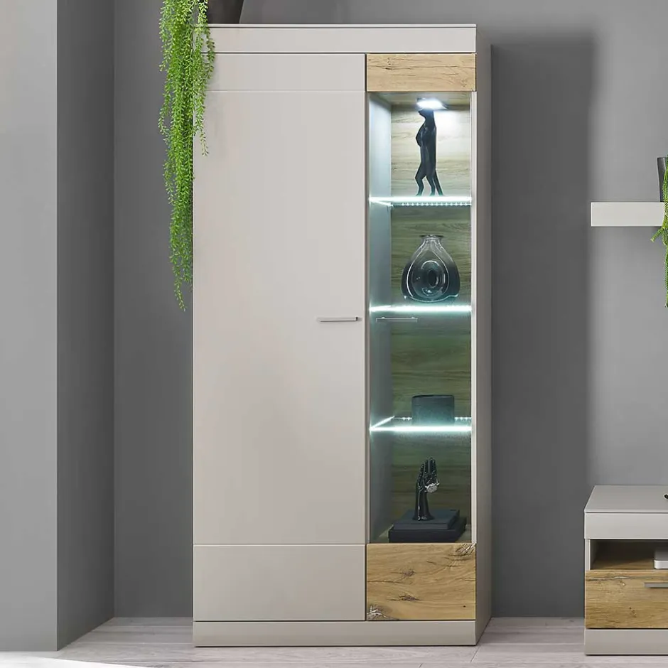 - Schicke Vitrine in Hellgrau matt und Zinneichefarben, Glastür rechts