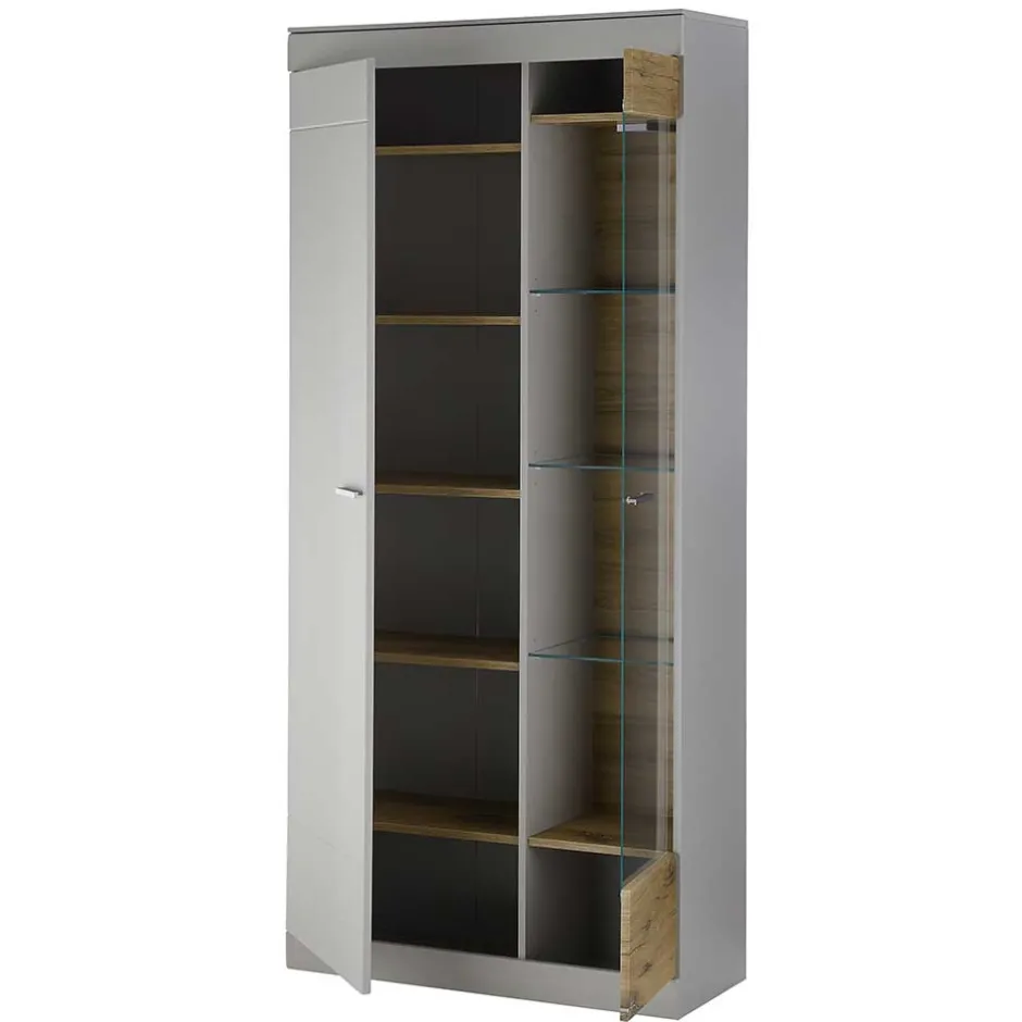 Mit einer Breite von 90 cm, einer Höhe von 199 cm und einer Tiefe von 35 cm, bietet die Vitrine „Lioscas“ reichlich Platz für all Ihre Schätze. Ausgestattet mit zwei Türen, wovon die rechte einen ansprechenden Glaseinsatz besitzt, finden Sie im Inneren zwei Konstruktions- und drei Einlegeböden auf der linken Seite und drei Glas- sowie zwei Konstruktionsböden rechts. Die gedämpften Metallbeschläge sorgen für ein sanftes und geräuschloses Schließen der Türen. Die dezenten grauen Metall Griffleisten verleihen der Vitrine eine zeitlose Eleganz.