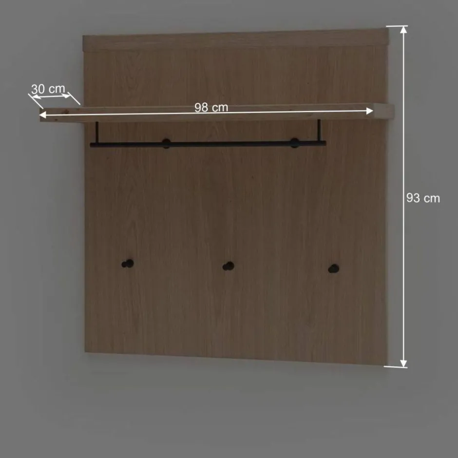 Mit Maßen von 98 cm Breite, 93 cm Höhe und 30 cm Tiefe bietet die Garderobe ausreichend Platz für Jacken und Accessoires. Die durchgehende Rückwand garantiert Stabilität und eine hochwertige Optik. Die praktische Hutablage und die drei schwarz lackierten Metallkleiderhaken sowie eine Kleiderstange bieten optimale Aufbewahrungsmöglichkeiten und runden das Gesamtbild ab.
