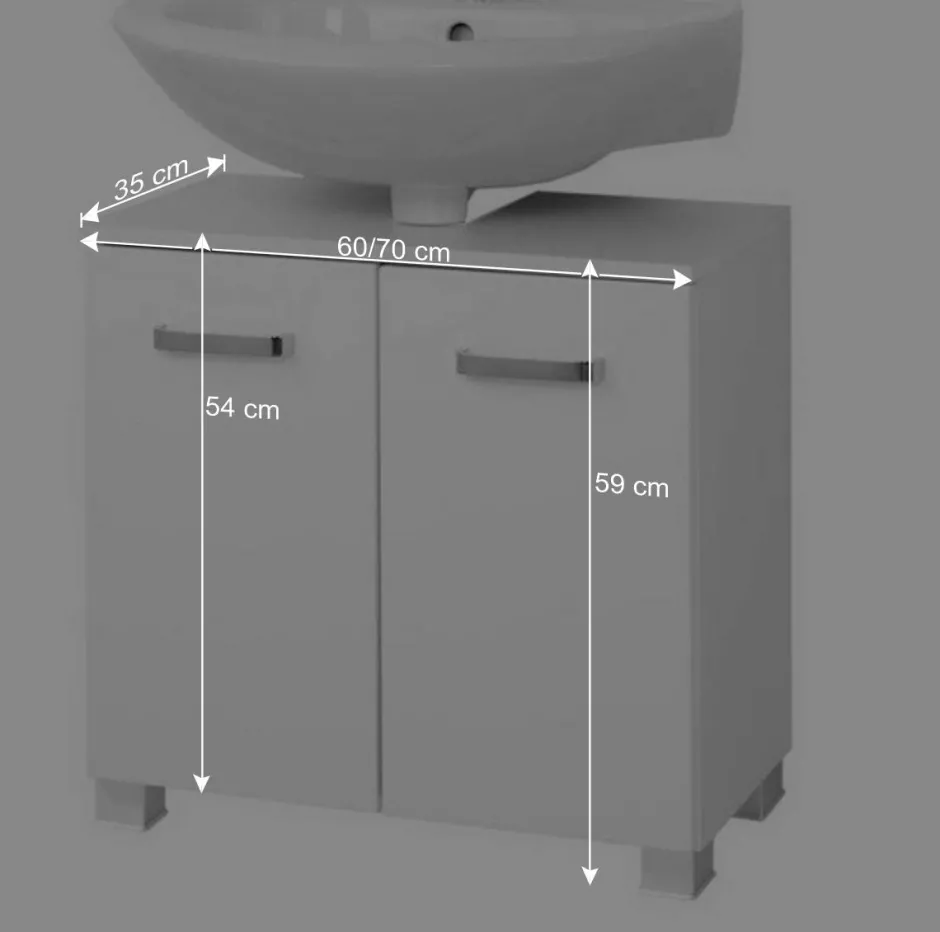 Je nach Platzangebot und Bedarf ist der Waschbeckenschrank in zwei Größen erhältlich: Variante 001 misst 60 cm in der Breite, 59 cm in der Höhe und 35 cm in der Tiefe. Variante 002 ist 70 cm breit, bei identischer Höhe und Tiefe. Die Höhe ohne Füße beträgt bei beiden Modellen ca. 54 cm. Damit passt sich „Sagunis“ perfekt an verschiedene Raumverhältnisse an und bietet gleichzeitig optimalen Stauraum für Badutensilien.