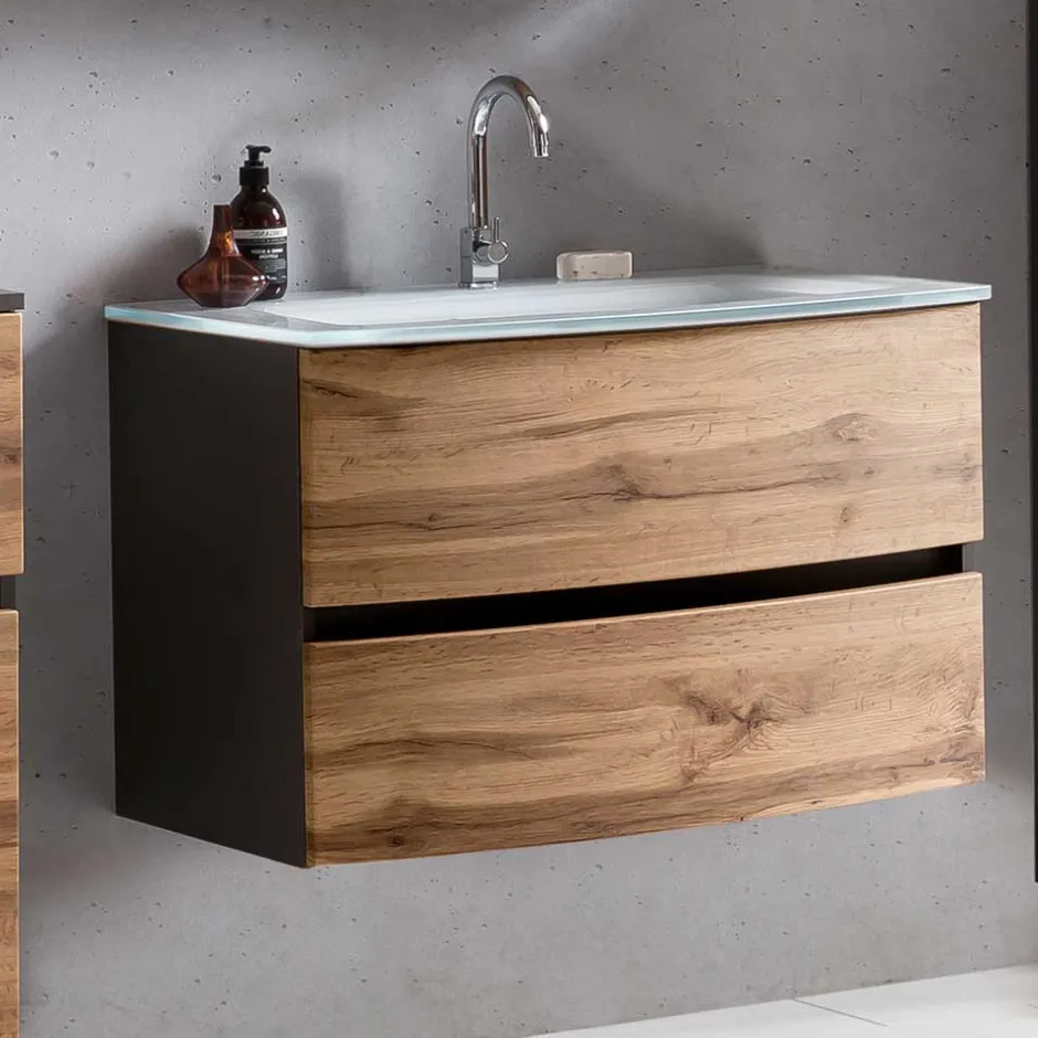 Ein harmonischer Farbkontrast aus warmer Wildeicheoptik und elegantem Dunkelgrau verleiht dem Waschtisch seine moderne, aber dennoch wohnliche Wirkung. Das Design folgt klaren Linien, ergänzt durch sanft geschwungene Fronten, die Leichtigkeit und Dynamik in den Raum bringen. Modernes Design bedeutet hier nicht Kälte, sondern Stil – eine Kombination aus Natürlichkeit und urbaner Eleganz, die jedes Badezimmer zu einem Highlight macht.