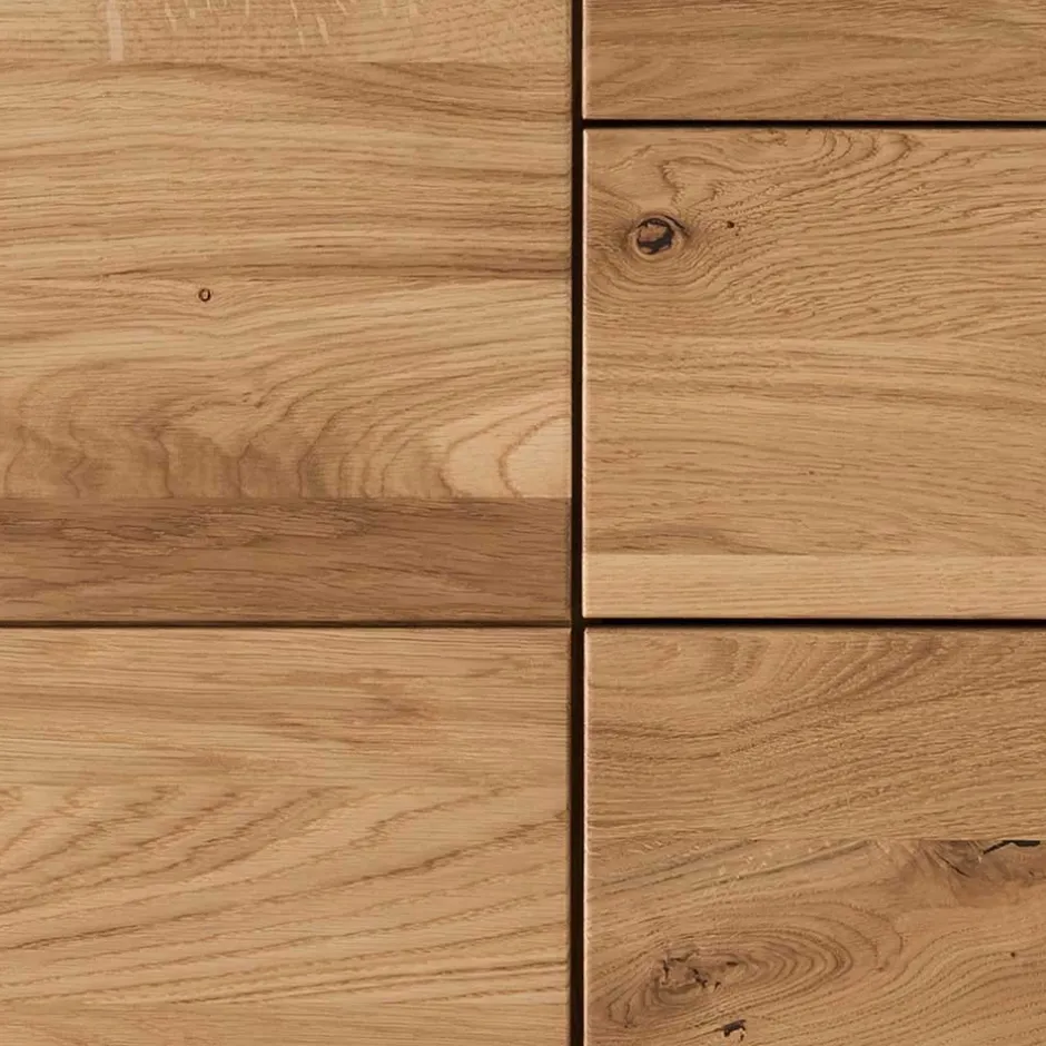 Die Oberfläche der Kommode ist natürlich geölt, was das Wildeichenholz nicht nur schützt, sondern auch die lebendige Maserung betont. Diese Behandlung macht das Holz widerstandsfähiger gegen Schmutz und Flüssigkeiten, während es gleichzeitig atmen kann, was zur Langlebigkeit des Möbelstücks beiträgt.