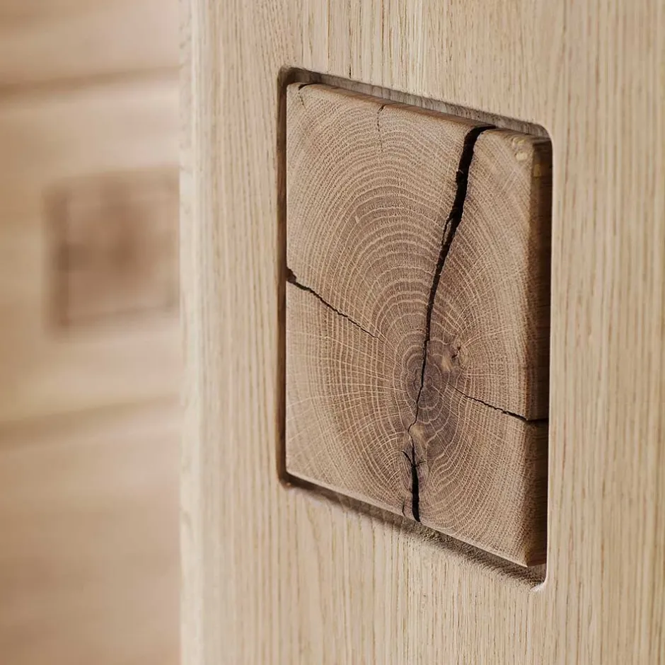 Die Ober- und Unterböden sind mit profilierten Eiche massiv Anleimern versehen. Diese Technik bietet eine zusätzliche Stabilität und zeigt, dass bei der Herstellung kein Detail übersehen wurde. Einen besonderen Akzent setzen die einzigartigen Applikationen aus Hirnholz an den Türfronten. Hirnholz bezeichnet das Holz an den Enden von geschnittenen Holzstücken, es betont das natürliche Design und bietet ein einzigartiges Muster.