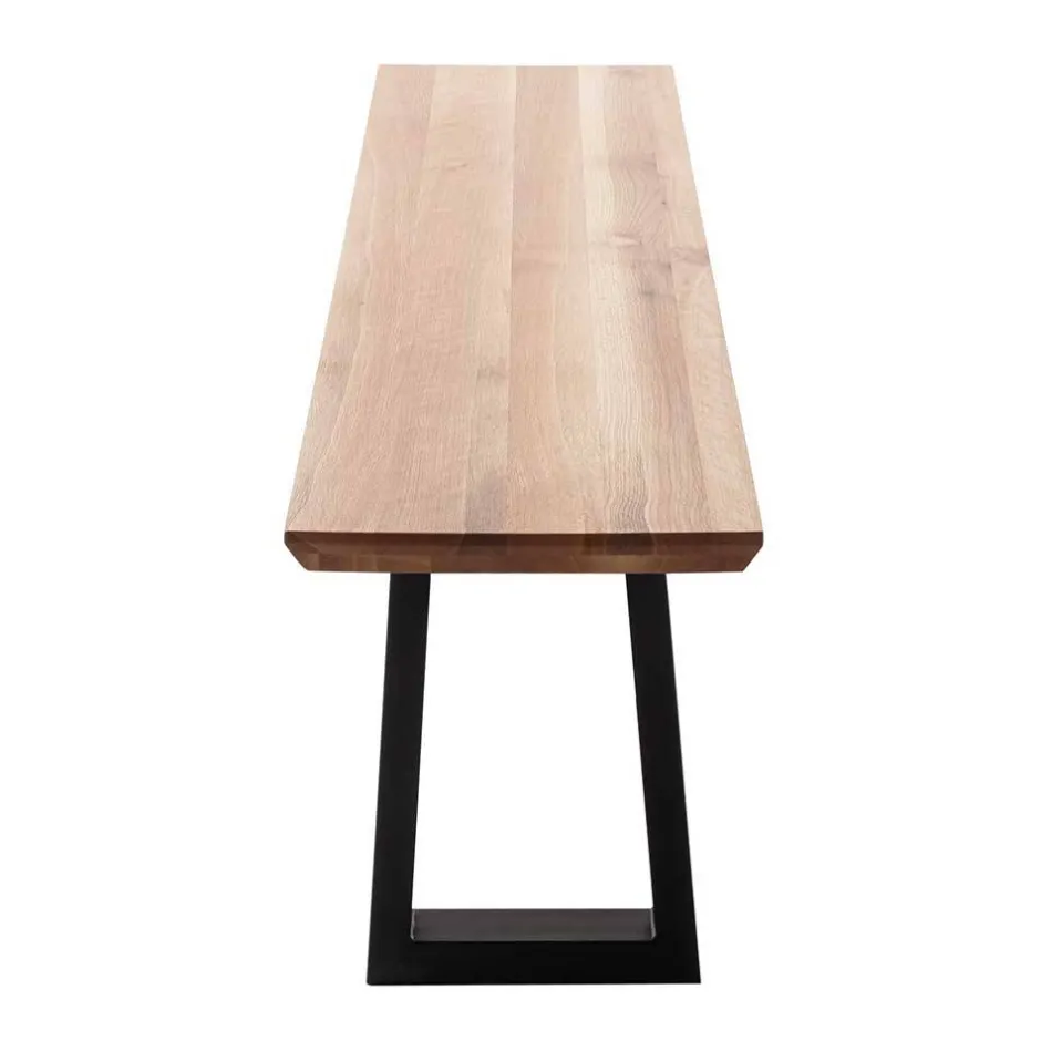 Die Standfestigkeit der Bank wird durch die zwei Trapez-Bügelbeine aus schwarz pulverbeschichtetem Metall gewährleistet, die nicht nur funktional sind, sondern auch einen industriellen Touch hinzufügen. Die Kombination von Holz und Metall schafft eine harmonische Balance zwischen traditionellem Charme und modernem Design. Die Bank wird in demontierter Form geliefert, jedoch ermöglicht die beiliegende Aufbauanleitung eine einfache und schnelle Selbstmontage.