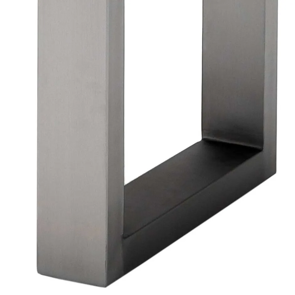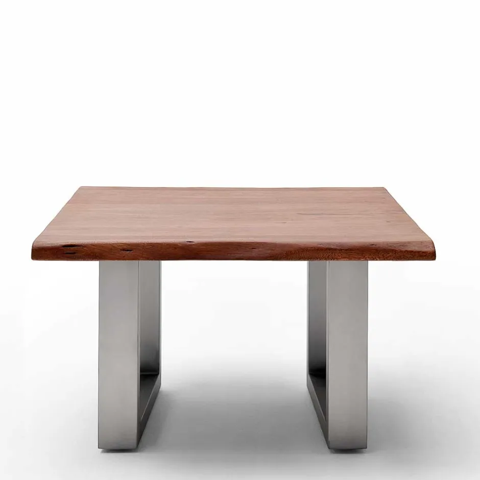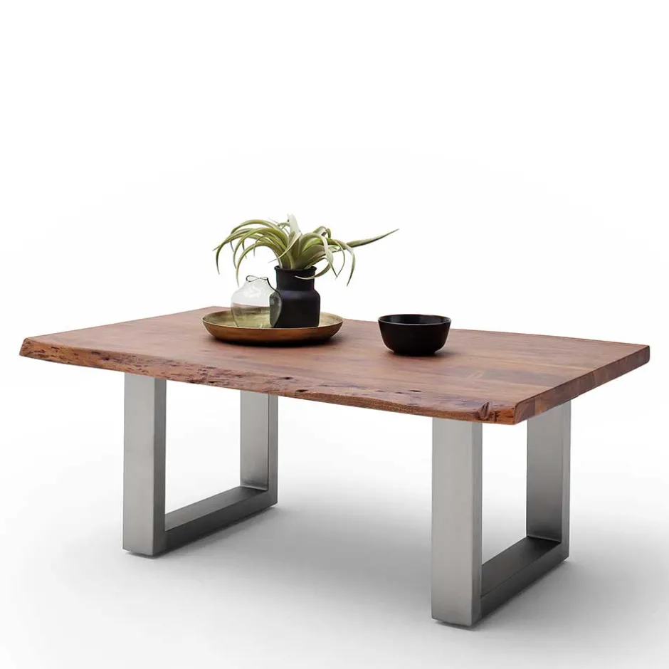 Faszinierend ist der Kontrast zwischen der warmen Holzplatte und dem Gestell aus gebürstetem Edelstahl. Das Metall mit seinem leicht schimmernden, kühlen Silberton wirkt puristisch und modern. Die gebürstete Oberfläche ist nicht nur ästhetisch ansprechend, sondern auch pflegeleicht, da sie unempfindlicher gegenüber Fingerabdrücken ist. Zusammen mit dem Holz schafft der Edelstahl einen ausdrucksstarken Look, der perfekt zum Industrie- und Loft-Stil passt und den Couchtisch „Roccoss“ zum stilvollen Herzstück Ihres Wohnzimmers macht.