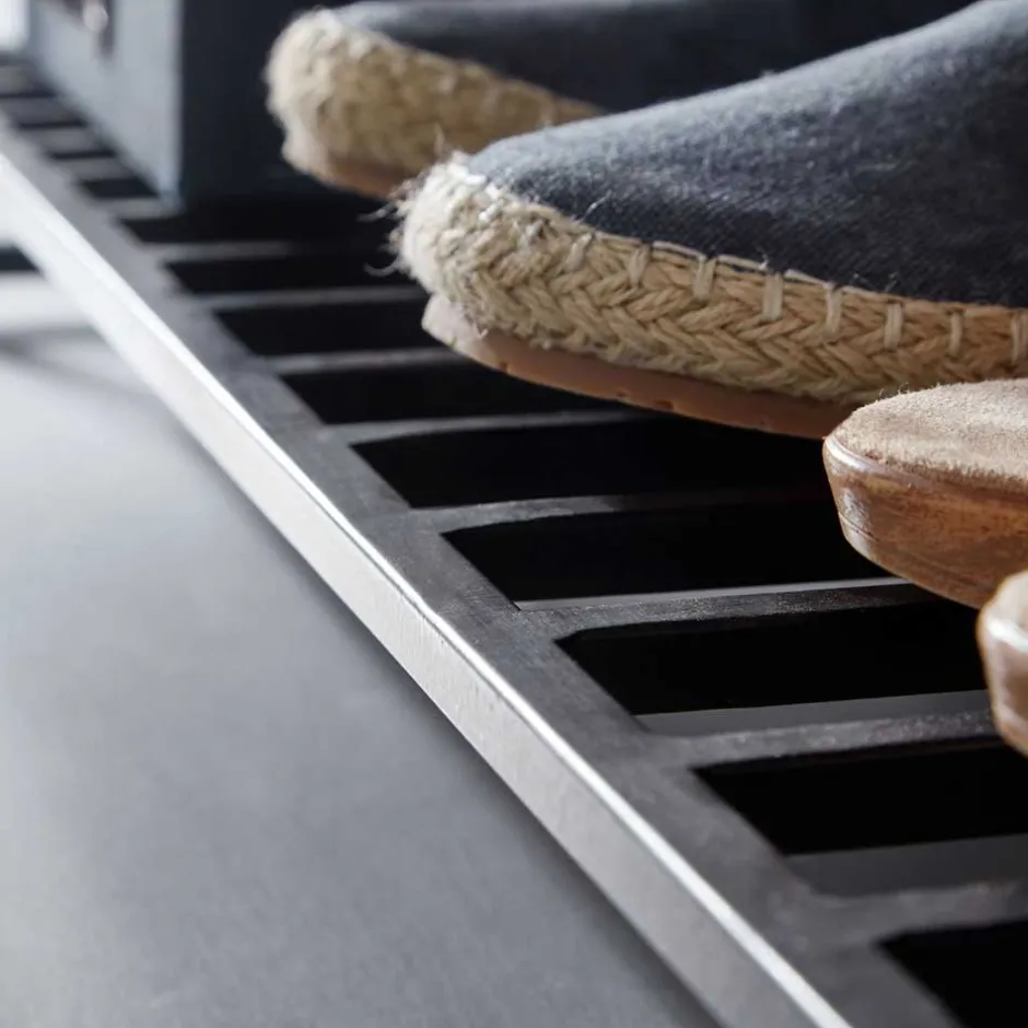 Ein stabiles Metallgestell sorgt für einen sicheren Stand und trägt zu der beeindruckenden Belastbarkeit von bis zu 200 kg bei. Das Metall ist in Schwarz pulverbeschichtet, ein Verfahren, bei dem Farbe in Pulverform aufgetragen und anschließend eingebrannt wird. Diese Methode schafft eine besonders strapazierfähige und gleichmäßige Oberfläche, die vor Korrosion und Kratzern schützt. Das schwarze Gestell bildet einen eleganten Kontrast zum warmen Holzton und unterstreicht das moderne Design der Garderobenbank.